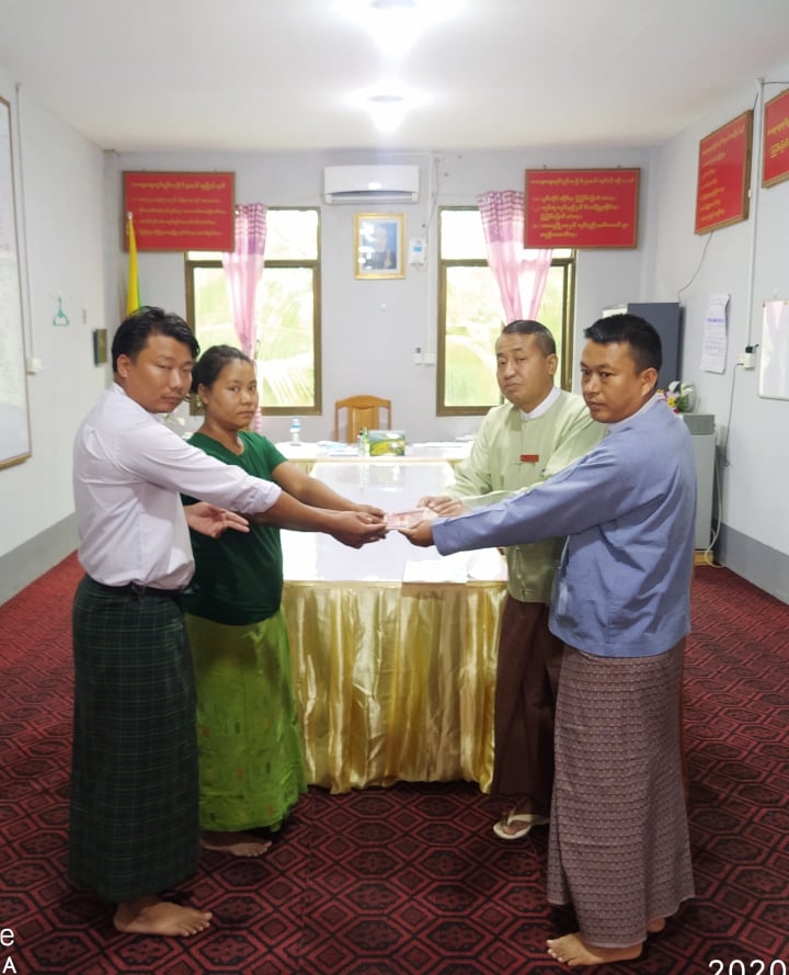 ထိုသို့ ဘေးသင့်အိမ်ထောင်စုအားထောက်ပံ့ရာတွင် ဆန်ရိက္ခာအတွက်ကျပ်ငွေ(၁၀၅၀၀)ကျပ်နှင့် အိမ်ဆောက်ပစ္စည်းအတွက် ကျပ်ငွေ (၁၀၀၀၀၀)ကျပ် စုစုပေါင်း  (၁၁၀၅၀၀)ကျပ်အား ကလေးမြို့ မြို့နယ်စီမံခန့်ခွဲမှုကော်မတီဉက္ကဌ ဦးကျုံးလျန်ထန်းနှင့်ကလေးခရိုင် ဘေးအန္တရာယ်ဆိုင်ရာစီမံခန့်ခွဲ ဦးစီးဌာနမှ လက်ထောက်ညွှန်ကြားရေးမှူး ဦးဇေယျစိုးတို့က ထောက်ပံ့ပေးအပ်ရာ ကလေးမြို့ အောင်မေတ္တာရပ်ကွက် အုပ်ချုပ်ရေးမှူး ဦးအေးသန့်နှင့်ဘေးသင့်အိမ်ထောင်စုမှ ဒေါ်တင်မာတို့က လက်ခံရယူခဲ့ကြကြောင်းသိရသည်။