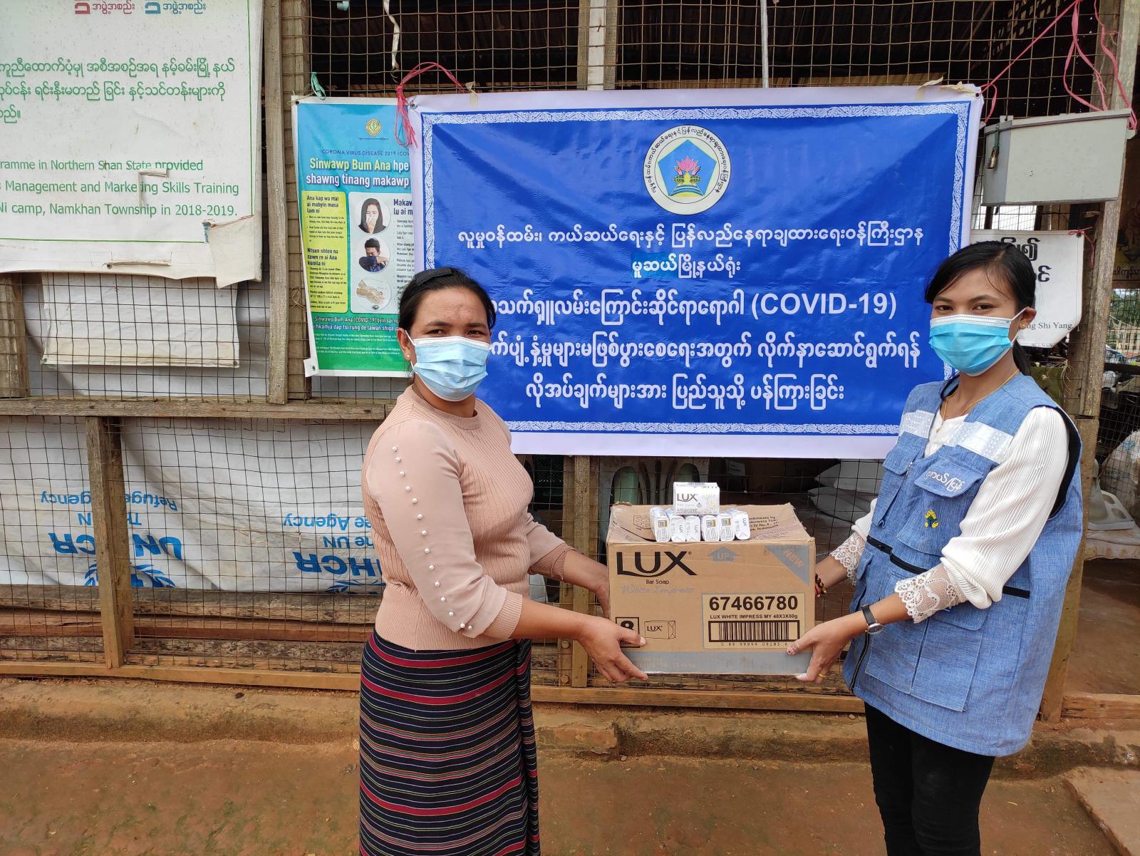 ရှမ်းပြည်နယ်(မြောက်ပိုင်း)၊ နမ့်ခမ်းမြို့နယ်တွင် ဖွင့်လှစ်ထားသော IDPs(Camps) စခန်း(၆)ခု အတွက် ကိုဗစ်-၁၉ ရောဂါကာကွယ်ရေးနှင့် ပတ်သက်၍ လက်ဆေးဆပ်ပြာခဲများကို ဘေးအန္တရာယ် ဆိုင်ရာ စီမံခန့်ခွဲမှုဦးစီးဌာနမှ ယမန်နေ့ နံနက်(၁၀)နာရီ အချိန်တွင် ထောက်ပံ့ ပေးအပ်ခဲ့သည်။