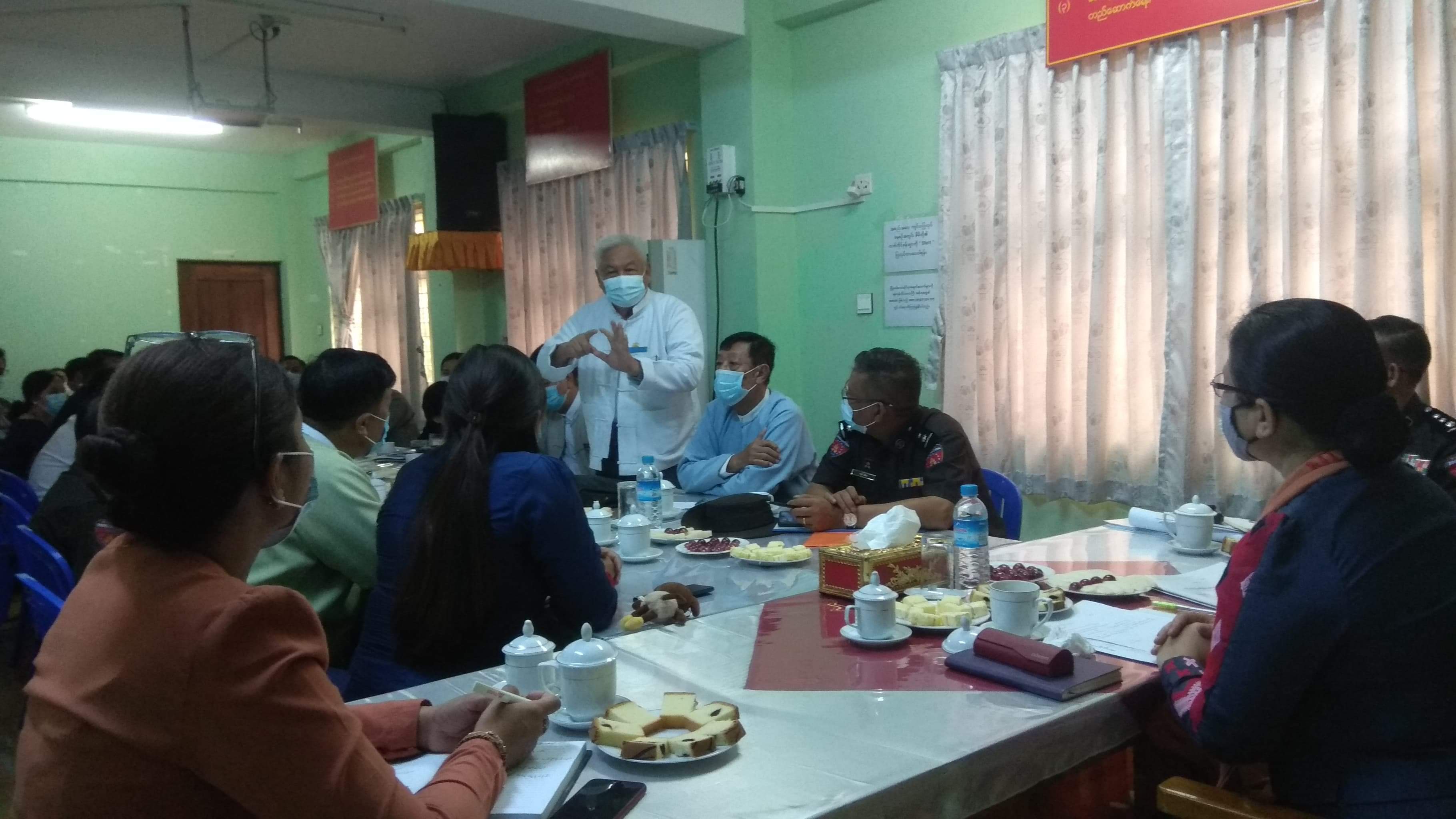 ဆက်လက်၍ မြို့နယ်အထွေထွေအုပ်ချုပ်ရေးဦးစီးဌာန၊ မြို့နယ်အုပ်ချုပ်ရေးမှူး ဦးမြင့်ခိုင်မှ အထွေထွေအုပ်ချုပ်ရေး ဦးစီးဌာန အနေဖြင့် ရွေးကောက်ပွဲဆိုင်ရာ လုပ်ငန်းများတွင် ကူညီဆောင်ရွက် ပေးနေမှုနှင့် လက်ရှိအခြေအနေများကို လည်းကောင်း၊ မြို့နယ်ရွေးကောက်ပွဲ ကော်မရှင်အဖွဲ့ခွဲ ဥက္ကဋ္ဌ ဦးလှဝင်းက မဲဆန္ဒရှင်စာရင်းများ တိကျမှန်ကန်ရေး အတွက် ဆောင်ရွက်နေမှုအခြေအနေများ၊ မဲရုံများဆောင်ရွက်နေမှု အခြေအနေနှင့် လိုအပ်ချက်များကို တောင်းဆို တင်ပြခြင်း များကိုဆောင်ရွက်ခဲ့သည်။