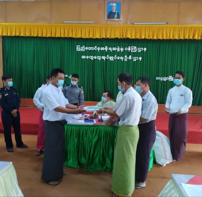 ထိုသို့ပေးအပ်ရာတွင် မြို့နယ်အတွင်းရှိ ပုံမှန်ဝင်ငွေမရှိသော အခြေခံလူတန်းစား အိမ်ထောင်စု (၃၁၀၀၅) အား တစ်အိမ်ထောင်လျှင် ငွေကျပ် (၂၀၀၀၀ိ/-)နှုန်းဖြင့် စုစုပေါင်းငွေကျပ် (၆၂၀၁၀၀၀၀၀/-)အား သက်ဆိုင်ရာ ရပ်ကွက် အုပ်ချုပ်ရေးမှူးများထံသို့ မြို့နယ်အထွေထွေ အုပ်ချုပ်ရေးဦးစီးဌာန၊ မြို့နယ် အုပ်ချုပ်ရေးမှူး ဦးမင်းဦးက လွှဲပြောင်းပေးအပ်ခဲ့ပြီး ရပ်ကွက်/ကျေးရွာအုပ်စု အုပ်ချုပ်ရေးမှူးများမှ မိမိတို့ ရပ်ကွက်/ကျေးရွာ အတွင်းရှိ ပုံမှန်ဝင်ငွေမရှိသော အိမ်ထောင်စုများ လက်ဝယ်အရောက် ထောက်ပံ့ပေးအပ် ခဲ့ကြောင်း သိရသည် ။