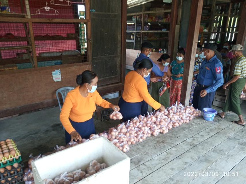 ထို့နောက် ကြက်ဥများကို တစ်လုံး(၁၀၀)ကျပ်ဖြင့် ဈေးနှုန်းချိုသာစွာ ရောင်ချပေးခဲ့ပြီး ကြက်ဥအလုံး (၂၀၀၀)ခန့်အား အိမ်ထောင်စုပေါင်း (၂၀၀)ကို အမှတ်(၂၈)ရေတပ် အခြေစိုက် စခန်းမှ ဗိုလ်မှူးချစ်ကို ဦးဆောင်မှုဖြင့် ဒေသခံပြည်သူများအား လာရောက် ရောင်းချပေးခဲ့ကြောင်း သိရသည်။
