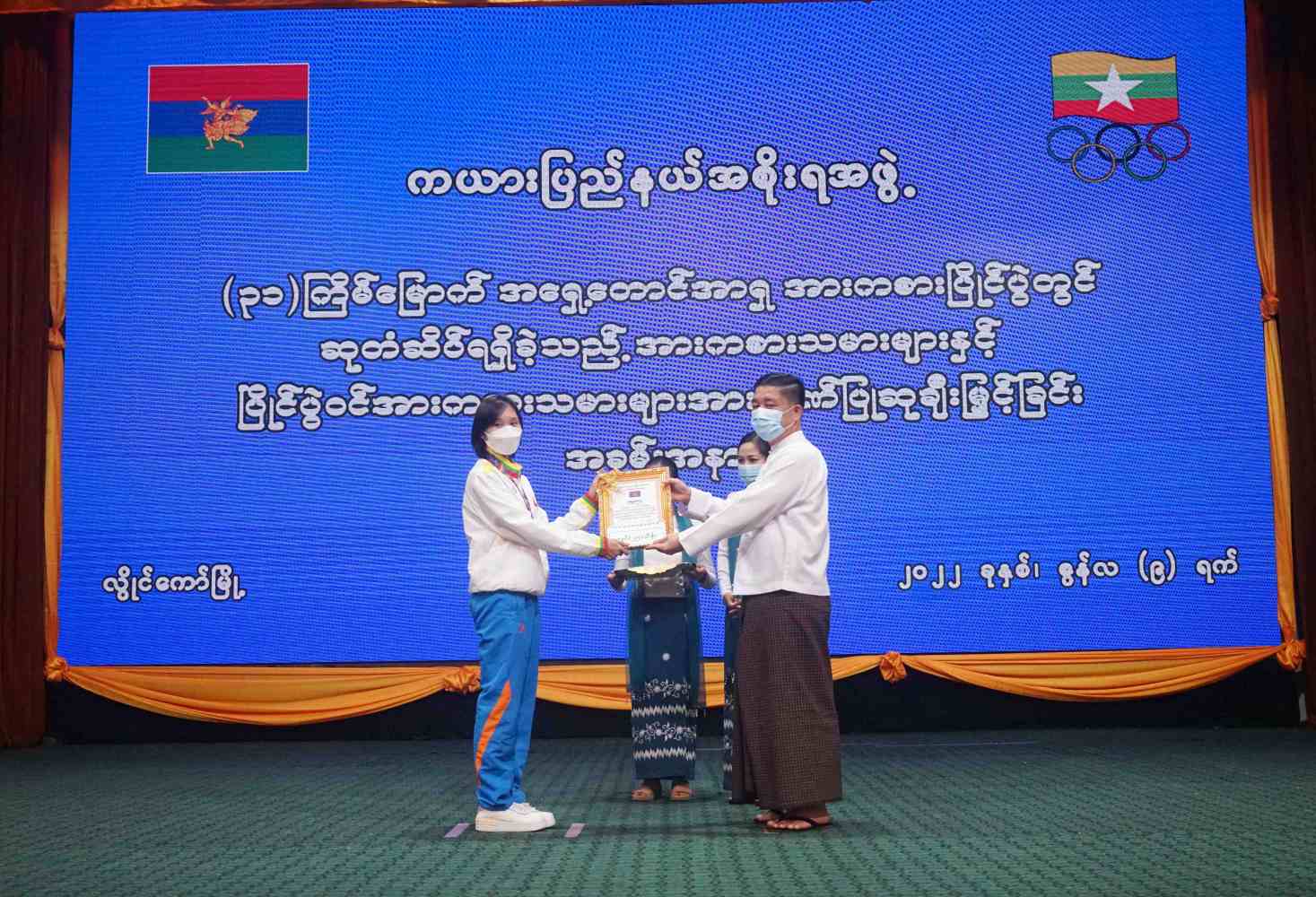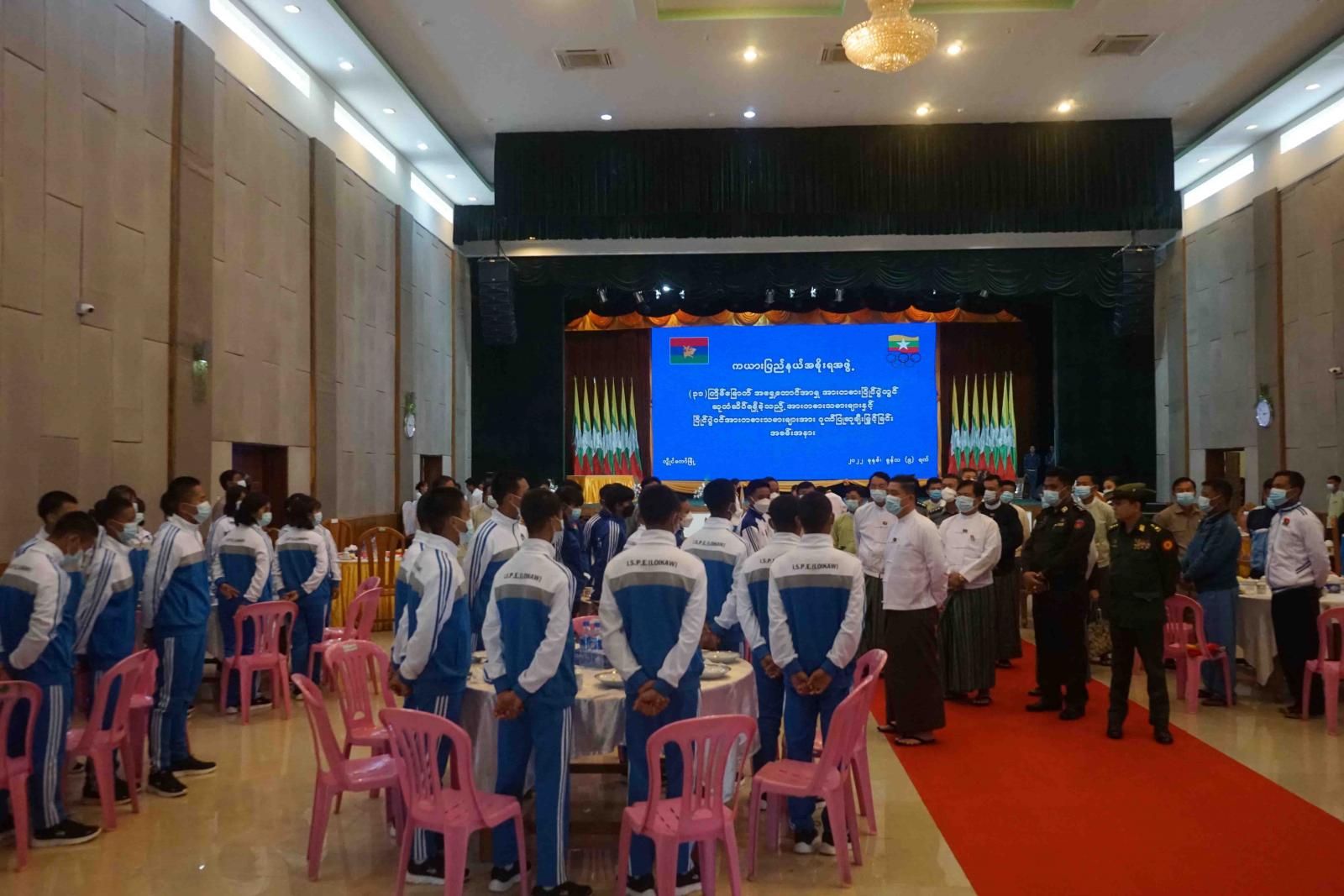ကယားပြည်နယ်အစိုးရအဖွဲ့မှ ဗီယက်နမ်နိုင်ငံ၌ ကျင်းပသည့် (၃၁) ကြိမ်မြောက် အရှေ့တောင်အာရှ အားကစားပြိုင်ပွဲတွင် ဆုတံဆိပ်ရရှိခဲ့ကြ သည့် ကယားပြည်နယ်မှ အားကစားသမားများနှင့် ပြိုင်ပွဲဝင် ကစားသမားများအား ဂုဏ်ပြုချီးမြှင့်ခြင်းနှင့် ပြည်နယ်နှင့် တိုင်းဒေသကြီးများတွင် ကျင်းပပြုလုပ်မည့် အားကစားပြိုင်ပွဲများသို့ ဝင်ရောက်ယှဉ်ပြိုင်ကြမည့် အားကစားအသင်းများအား ထောက်ပံ့ငွေပေးအပ်ခြင်း အခမ်းအနားကို ယမန်နေ့ မွန်းလွဲပိုင်းက လွိုင်ကော်မြို့၊ ပြည်နယ်ခန်းမ၌ ကျင်းပခဲ့သည်။