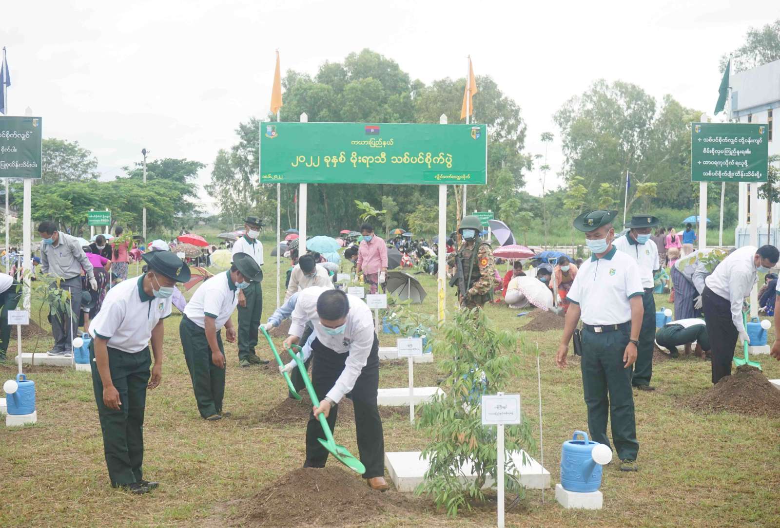 ကယားပြည်နယ် သစ်တောဦးစီးဌာနအနေဖြင့် မိုးရာသီသစ်ပင်စိုက်ပျိုးပွဲတော်များအတွက် ဒေသမျိုးရင်း အဖိုးတန်သစ်မျိုးများ ၊ ရာသီအလိုက်ဖူးပွင့်နိုင်သည့် အပင်များ ၊ ကြီးမြန်သစ်မျိုးများ ၊ အရိပ်ရသစ်မျိုး များပါဝင်သည့် လူထုဖြန့်ပျိုးပင် (၁၀၂,၅၀၀)ကိုပျိုးထောင်ထားပြီး ယနေ့မိုးရာသီ စုပေါင်းသစ်ပင် စိုက်ပွဲတွင် ပြည်နယ်အစိုးရအဖွဲ့၏ ဦးဆောင်မှုဖြင့် ကံ့ကော် ၊ စိန်ပန်းနီ ၊ စိန်ပန်းပြာ ၊ မဟော်ဂနီ ၊ ခရေ စသည့် သစ်မျိုးပင် (၁၃)မျိုး၊ စုစုပေါင်း ၂၃၀၄ ပင်ကို သစ်ပင်စိုက်ပျိုးပွဲတော်သို့ တက်ရောက်လာကြသည့် အင်အား (၂၅၀)ကျော်တို့က သတ်မှတ်နေရာများတွင် ပျော်ရွင်စွာဖြင့် စုပေါင်း စိုက်ပျိုးခဲ့ကြကြောင်း သိရသည်။