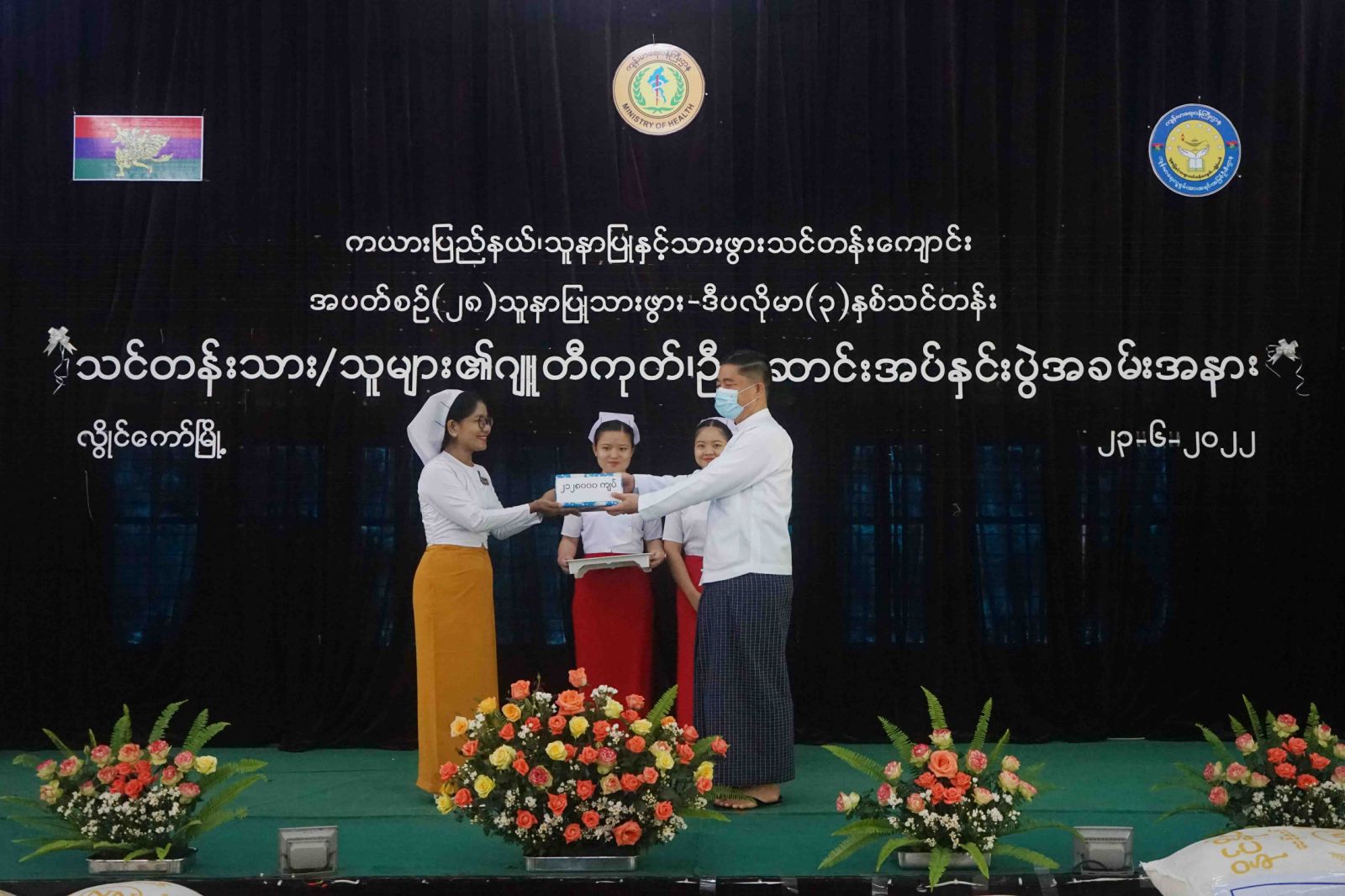 ယင်းနောက် ပြည်နယ်ဝန်ကြီးချုပ်နှင့် တာဝန်ရှိသူများက သူနာပြုနှင့် သားဖွားသင်တန်းကျောင်းရှိ သင်တန်းသား၊ သင်တန်းသူများအား ဆန်၊ဆီနှင့် ထောက်ပံ့ငွေများ ထောက်ပံ့ပေးအပ်ခဲ့ကြပြီး သင်တန်းသူတစ်ဦးမှ ကျေးဇူးတင်စကားပြန်လည်ပြောကြားခဲ့ကြောင်း သိရသည်။