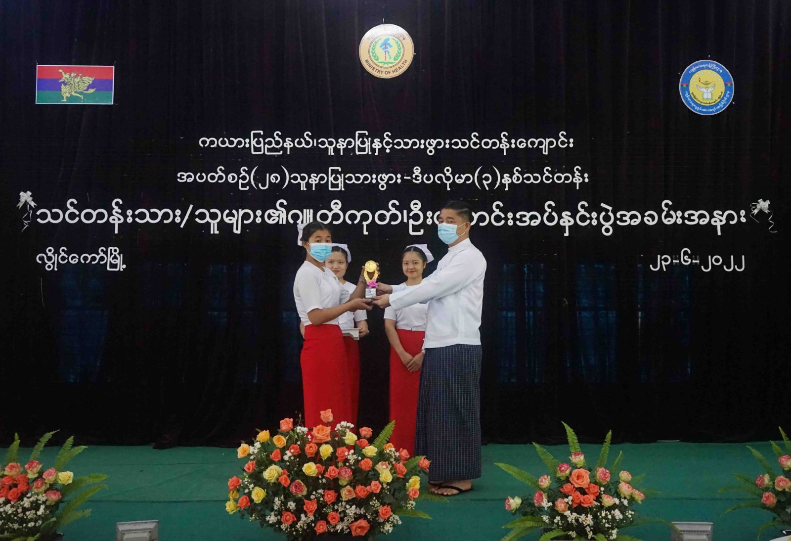 ဆက်လက်၍ ပြည်နယ်ဝန်ကြီးချုပ်က ဒုတိယနှစ်သင်တန်းမှ ပထမဆု၊ ဒုတိယဆု၊ တတိယဆု ရရှိသော သင်တန်းသူများကိုလည်းကောင်း၊ သူနာပြုနှင့်သားဖွားသင်တန်းကျောင်း၊ ကျောင်းအုပ်ကြီးက ပထမနှစ် သင်တန်းမှ ပထမဆု၊ ဒုတိယဆု၊ တတိယဆုရရှိသော သင်တန်းသူများကိုလည်းကောင်း ဆုများအသီးသီး ချီးမြှင့်ပေးအပ်ခဲ့ပြီး ကျောင်းအုပ်ကြီး ဒေါ်မာမာဆွေ က သူနာပြုများလိုက်နာရမည့် ကျင့်ဝတ်များ၊ ဆက်လက်လေ့လာဆည်းပူးရမည့် ပညာရေးဆိုင်ရာ အခွင့်အလမ်းများနှင့် စပ်လျဉ်း၍ ရှင်းလင်းပြောကြားခဲ့သည်။
