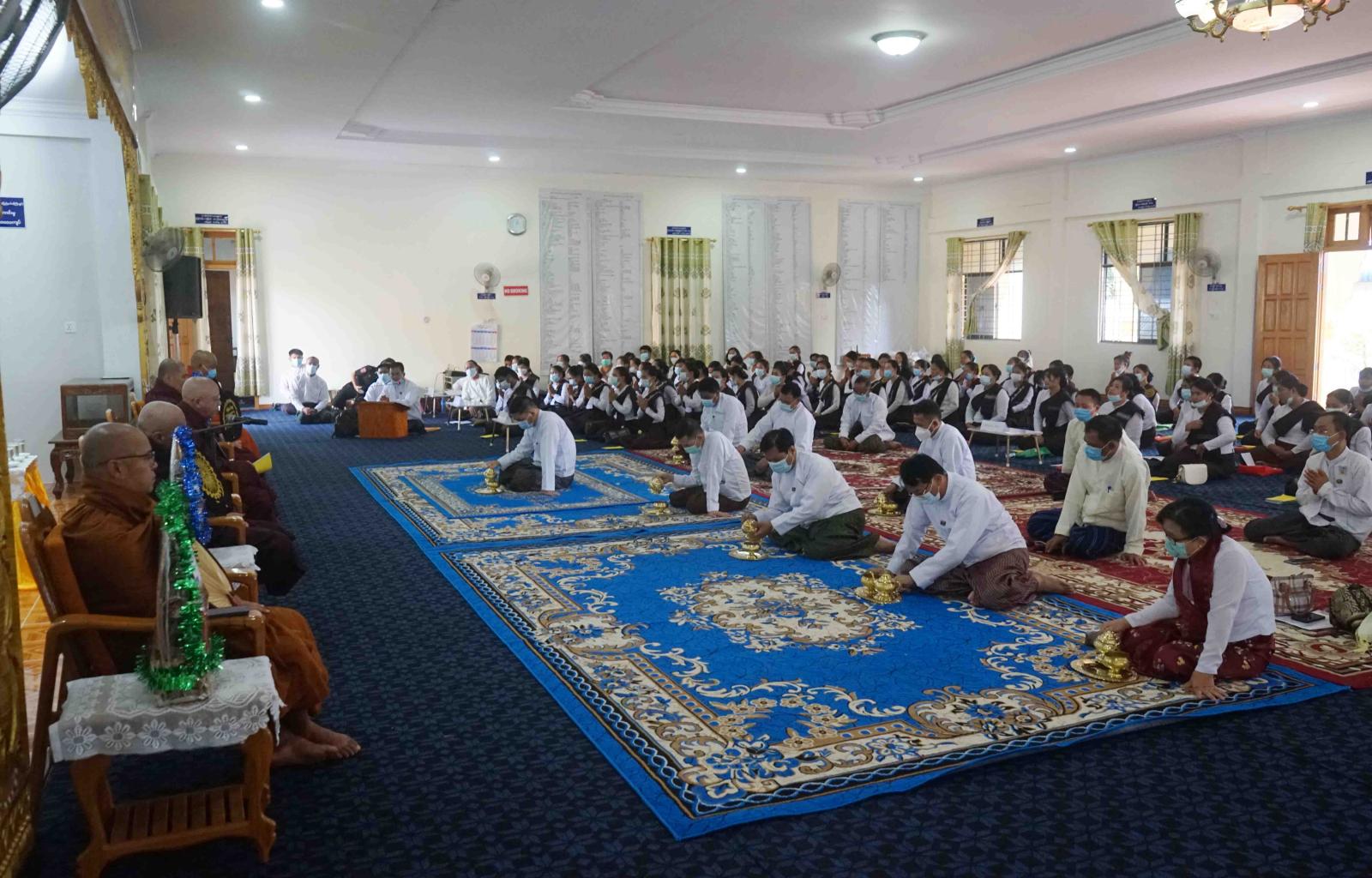 ရှေးဦးစွာ အခမ်းအနားသို့ ကြွရောက်လာကြသည့် ဆရာတော်သံဃာတော် အရှင်သူမြတ်များ၊ ကယားပြည်နယ်အစိုးရအဖွဲ့၊ ပြည်နယ်ဝန်ကြီးချုပ်နှင့် ပြည်နယ်အစိုးရအဖွဲ့ဝင်၊ ပြည်နယ်ဝန်ကြီးများ၊ ဌာနဆိုင်ရာအသီးသီးမှ တာဝန်ရှိသူများနှင့် ဝတ်အသင်းအဖွဲ့များက “နမောတဿ” သုံးကြိမ်ရွတ်ဆို ဘုရားကန်တော့၍ အခမ်းအနားကို ဖွင့်လှစ်ခဲ့ပြီး ပြည်နယ်ဩဝါဒါစရိယ၊ (အဂ္ဂမဟာသဒ္ဓမ္မဇောတိကဓဇ) သီရိမင်္ဂလာပုံ(ဟော်ကြီး)ကျောင်း ဆရာတော်ဘဒ္ဒန္တစန္ဒိမာထံမှ ငါးပါးသီလခံယူ ဆောက်တည်ခဲ့သည်။