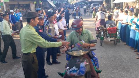 အိမ်မဲမြို့တွင် ဒို့အတူတူမဲပေးကြမယ် လက်ကမ်းစာစောင်များ ဖြန့်ဝေပြီး ရွေးကောက်ပွဲဆိုင်ရာ အသိပညာပေး ဆိုင်းဘုတ်ဆိုက်ထူ