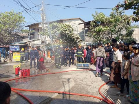 ပြည်ကြီးတံခွန်မြို့နယ် ချမ်းမြသာယာရပ်ကွက်တွင် မီးဘေးကြိုတင်ကာကွယ်ရေးအတွက်ဇာတ်တိုက်သရုပ်ပြလေ့ကျင့်ခြင်းများ  ဆောင်ရွက်