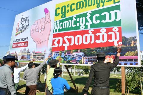 ဇေယျာသီရိမြို့နယ်၌ ပါတီစုံဒီမိုကရေစီအထွေထွေရွေးကောက်ပွဲဆိုင်ရာ အသိပညာပေး မြေစိုက်ပိုစတာ(Billboard) စိုက်ထူ