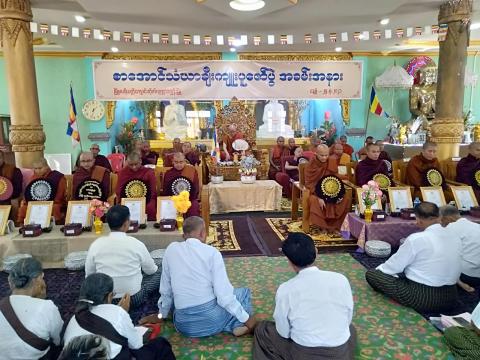 ပုဏ္ဏားကျွန်း မေ ၂၆ ရခိုင်ပြည်နယ်၊ ပုဏ္ဏားကျွန်းမြို့၌ ၂၀၂၀ ပြည့်နှစ်တွင် သာသနာရေးနှင့် ယဉ်ကျေးမှု ဝန်ကြီးဌာနမှကြီးမှူးကျင်းပသော အစိုးရ သာသနဓဇ ဓမ္မစရိယဘွဲ့တံဆိပ်တော်ရ သံဃာတော် (၈) ပါးအား ထပ်ဆင့်ဂုဏ