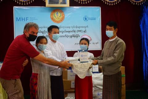 ကုလသမဂ္ဂကမ္ဘာ့စားနပ်ရိက္ခာအစီအစဉ် (WFP)မှ ကချင်ပြည်နယ်ကုသရေးနှင့်ပြည်သူ့ကျန်းမာ ရေးဦးစီးဌာနအတွက် ကိုဗစ် - ၁၉ ရောဂါ ကာကွယ်၊ ထိန်းချုပ်၊ ကုသရေးလုပ်ငန်းများတွင် အသုံးပြုနိုင်ရန် ဒေါ်လာ (၁)သိန်းခွဲခန့်တန်ဖိုးရှိ (PPE)ဝတ်စုံနှင့် ဆက်စပ်ပစ္စည်းကိရိယာများကို ယနေ့ နံနက် (၁၀)နာရီတွင် အထွေထွေရောဂါကုဆေးရုံကြီး အစည်းအဝေးခန်းမ၌ ပေးအပ်လှူဒါန်း ခဲ့သည်။