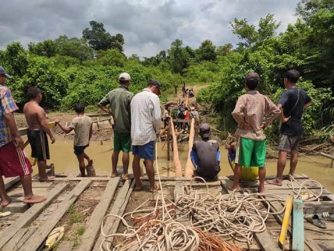 တမူးခရိုင်၊ မြို့သစ်မြို့တွင် ချောင်းရေတိုက်စား၍ ပြိုကျသွားသော သစ်သားတံတားအား ယာယီသွားလာနိုင်ရေး ကိုယ်ထူ ကိုယ်ထဆောင်ရွက်