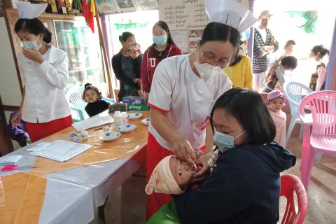 ရှမ်းပြည်နယ်(တောင်ပိုင်း)လွိုင်လင်မြို့ ၌ အမျိုးသမီးကျန်းမာရေးဆရာမ ဒေါ်သန္တာအောင်နှင့် သူနာပြုများက လွိုင်လင်မြို့ အမှတ်(၄)ရပ်ကွက်အတွင်းရှိ အသက်(၆)လမှ (၉)နှစ်အထိ ကလေးများအား ဗီတာမင် အေ နှင့် သံချဆေးပုံမှန်တိုက်ကျွေးခြင်းကို ယနေ့နံနက်(၉)နာရီက ရပ်ကွက်အုပ်ချုပ်ရေးမှူးရုံးတွင် ဆောင်ရွက်ခဲ့ကြောင်း သိရသည်။