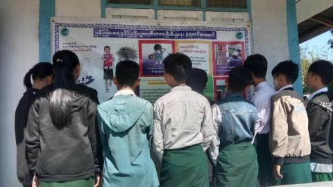 မိုင်းခုတ်မြို့ လူထုအခြေပြုဗဟိုဌာန(community center)ခန်းမတွင် စာဖတ်ရှိန်မြှင့်တင်ရေးနံရံကပ်စာစောင်နှင့် စာအုပ်စာစောင်ပြသ