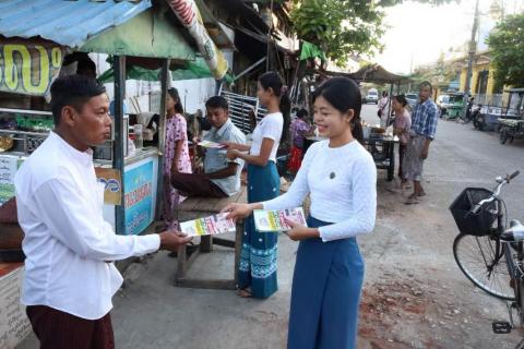 ဆိပ်ကြီးခနောင်တိုမြိုနယ်၌ “ဒို့အတူတူမဲပေးကြမယ်” လက်ကမ်းစာစောင်များ ပြည်သူများ လက်ဝယ်အရောက် ဖြန့်ဝေ
