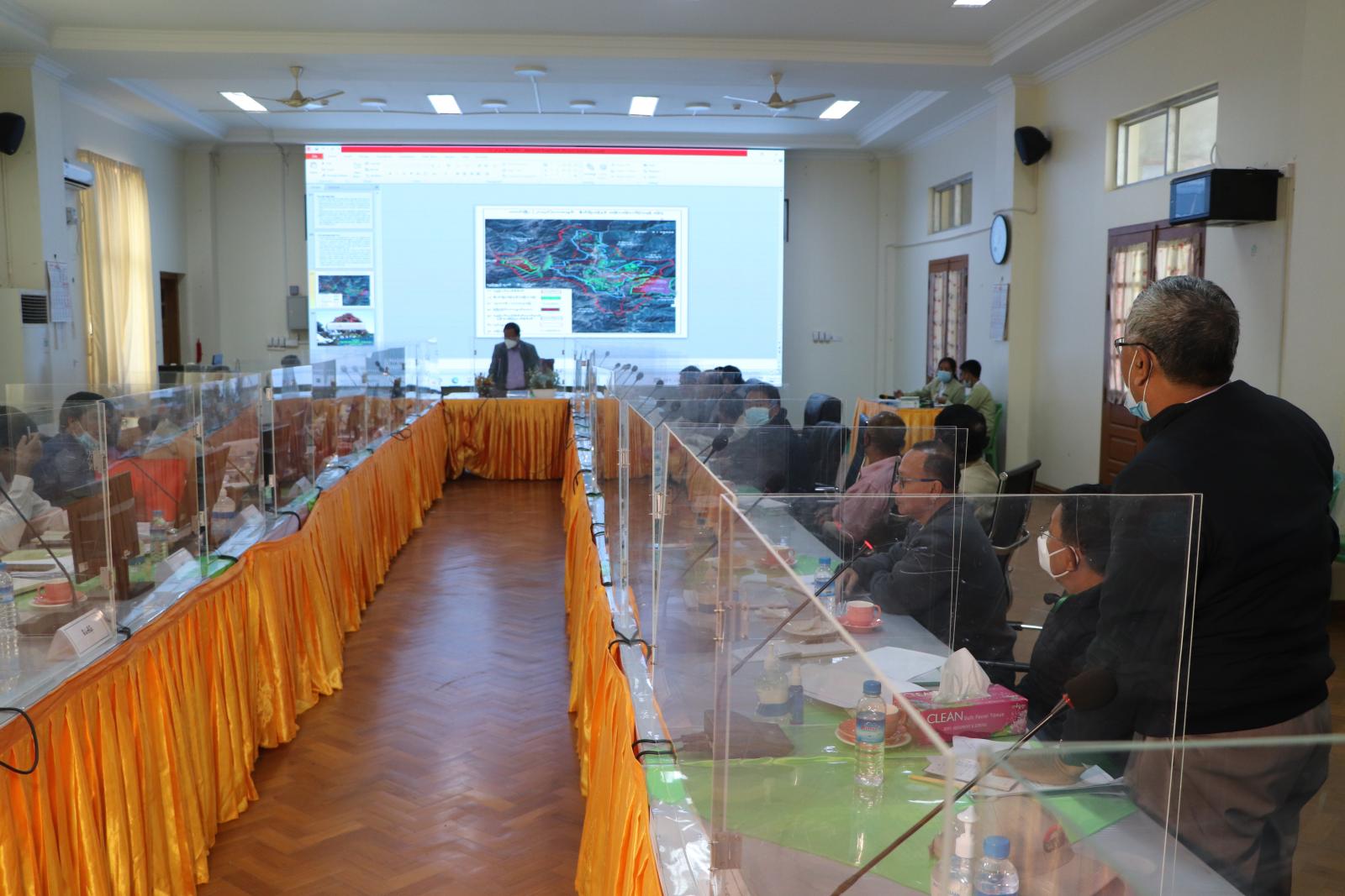 ထို့နောက် ပြည်နယ်မြေလွတ်၊ မြေလပ်နှင့်မြေရိုင်များ စီမံခန့်ခွဲရေးကော်မတီ အတွင်းရေးမှူး၊ ပြည်နယ် လယ်ယာမြေစီမံခန့်ခွဲရေးနှင့် စာရင်းအင်းဦးစီးဌာနမှ ပြည်နယ်ဦးစီးမှူး ဦးမြင့်ကြိုင်က ဟားခါးမြို့ စည်ပင် သာယာရေးအဖွဲ့မှ ဟားခါးမြို့တိုးချဲ့ရန်အတွက် မြို့နယ်နိမိတ် ပြင်ဆင်ဖွဲ့စည်း ခဲ့သည့် (၂၈၀၉၆) ဧကအတွင်းမှ မြေလွတ်၊ မြေလပ်နှင့် မြေရိုင်း ၂၄၈၄၄ ဒဿမ ၄၈ ဧကအား အစိုးရကခွင့်ပြုထားသော ဥပဒေနှင့် ညီညွတ်သည့် အခြားလုပ်ငန်းအတွက် လုပ်ပိုင်ခွင့်၊ အသုံးပြု ခွင့်လျှောက်လွှာ (ပုံစံ−၄)ဖြင့် လျှောက်ထားမှုအပေါ် ကန့်ကွက်မှုများနှင့် ပတ်သက်၍ သီးခြားအဖွဲ့ ၏ စစ်ဆေးတွေ့ရှိချက် အစီရင်ခံစာကို Power Point ဖြင့် ရှင်းလင်းတင်ပြသည်။