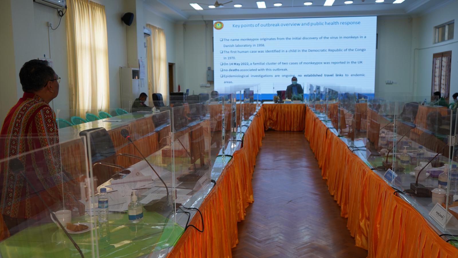 ဆက်လက်၍ ချင်းပြည်နယ်အစိုးရအဖွဲ့ရုံးမှ ဒုတိယညွှန်ကြားရေးမှူး ဦးမြင့်လွင်က ယခင်အပတ် အစည်းအဝေး ဆုံးဖြတ်ချက်များနှင့် မြို့နယ်များမှ တင်ပြလာသည့်အုပ်ချုပ်၊ ထောက်ပံ့မှုဆိုင်ရာများနှင့် ပြည်နယ်အတွင်း ကိုဗစ်-၁၉ ရောဂါ ထိန်းချုပ်ရေးအတွက် ကြိုတင်ပြင်ဆင်ဆောင်ရွက်မှု အခြေအနေများကိုလည်းကောင်း၊ ပြည်နယ်ပြည်သူ့ကျန်းမာရေးနှင့် ကုသရေးဦးစီးဌာနမှ ဒုတိယပြည်နယ်ဦးစီးမှူး ဒေါက်တာရန်နိုင်က ချင်းပြည်နယ်အတွင်း ကိုဗစ်−၁၉ ရောဂါ ကာကွယ်၊ ထိန်းချုပ်ရေးလုပ်ငန်းများ ဆောင်ရွက်မှု၊ ၂၅.၇.၂၀၂၂ ရက်နေ့အထိ ချင်းပြည်နယ်အတွင်း အသက် (၁၀)နှစ်အထက် ကိုဗစ်-၁၉ ရောဂါ ကာကွယ်ဆေး ထိုးနှံပြီးစီးမှု အခြေအနေ၊ အသက်(၅)နှစ်မှ (၁၂)နှစ်အထိနှင့် အသက်(၁၂)နှစ်မှ အသက် (၁၈) နှစ်အထိ ကျောင်းသား၊ ကျောင်းသူများ ကိုဗစ်-၁၉ ရောဂါ ကာကွယ်ဆေးထိုးနှံပြီးစီးမှုနှင့် ကိုဗစ်−၁၉ ရောဂါ ကာကွယ်ဆေး ရရှိ၊ သုံးစွဲ၊ လက်ကျန် စာရင်းနှင့် ကိုဗစ်−၁၉ ရောဂါ ကာကွယ်ရေးပစ္စည်းများ အခြေအနေနှင့် မျောက်ကျောက်ရောဂါ ကူးစက်နိုင်ခြေရှိသည့် နည်းလမ်းများနှင့် ကာကွယ်နိုင်မည့် နည်းလမ်းများကို လည်းကောင်း တက်ရောက် လာကြသည့် ဌာနဆိုင်ရာ တာဝန်ရှိသူများက ကိုဗစ်−၁၉ ကာကွယ်ဆေး ဆက်လက်ထိုးနှံမည့် အစီအမံများ၊ မြို့ဝင်/မြို့ထွက် ဂိတ်များကို RDT Test Kit ဖြင့် ကိုဗစ်−၁၉ ရောဂါ ရှာဖွေစစ်ဆေးမှုအခြေအနေ၊ ကိုဗစ်-၁၉ ရောဂါ အသိ ပေးလုပ်ငန်းများ ဆောင်ရွက်မှု အခြေအနေများနှင့် လိုအပ်ချက်များကို ရှင်းလင်းတင်ပြကြသည်။