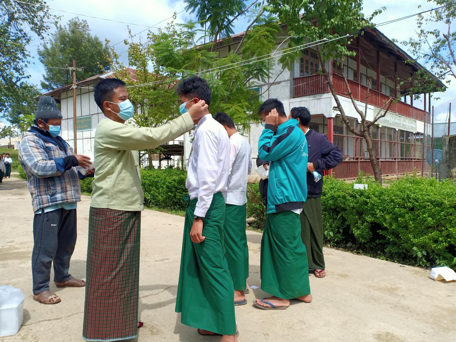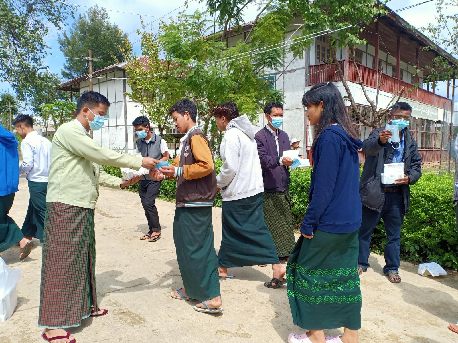 ထိုသို့နှာခေါင်းစည်းများ ဖြန့်ဝေရာတွင် တီးတိန်မြို့ လူစည်ကားရာနေရာဖြစ်သော မြို့မနာရီစင်လမ်းဆုံနှင့် တီးတိန်၊ အမှတ်(၁)အခြေခံပညာ အထက်တန်းကျောင်းတို့တွင် ခေတ္တမြို့နယ် အုပ်ချုပ်ရေးမှူး ဦးဟုန်းနိန်၊ မြို့နယ်စီမံအုပ်ချုပ်ရေးအဖွဲ့ အဖွဲ့ဝင်များ၊ ဌာနဆိုင်ရာများနှင့် ကျန်းမာရေးဝန်ထမ်းများက ပြည်သူများနှင့် ကျောင်းသူ၊ ကျောင်းသားများအား နှာခေါင်းစည်းများ ဖြန့်ဝေပေးခဲ့ကြောင်း သိရသည်။