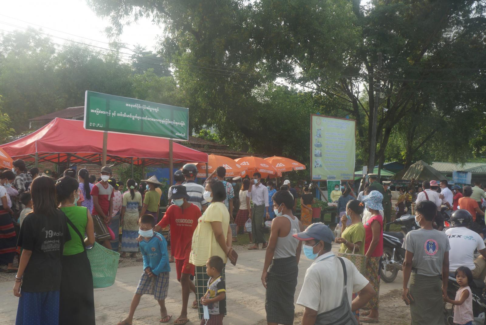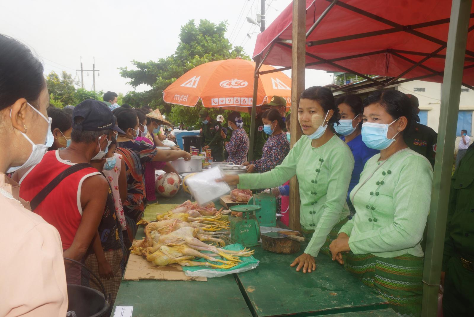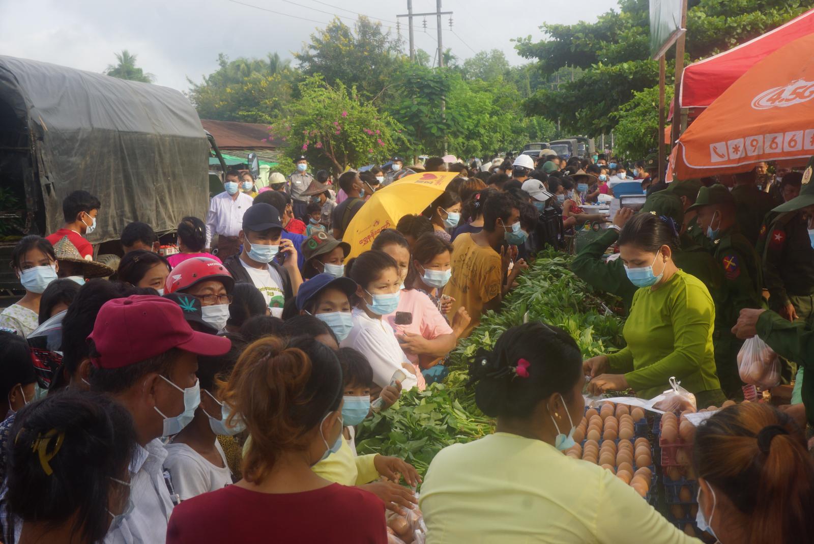 အဆိုပါ အခြေခံ စားကုန်နှင့် ဟင်းသီးဟင်းရွက်များအား သက်သာသော စျေးနှုန်းဖြင့် ရောင်းချပေးခြင်းကို အနောက်ပိုင်းတိုင်း စစ်ဌာနချုပ်မှ ဒုတိယတိုင်းမှူး ဗိုလ်မှူးချုပ် အောင်ကျော်မင်းနှင့် တာဝန်ရှိသူများက ကြည့်ရှုအားပေးပြီး တပ်နယ်မှ တာဝန်ရှိသူများက ပြည်သူများအား အခြေခံစားသောက်ကုန် ပစ္စည်းများ ဖြစ်ကြသည့် ဆန်တစ်ပြည်လျှင် (၁၆၀၀)ကျပ်၊ ဆီ(၁)ပိဿာ တစ်ဗူးလျှင်(၆၅၀၀)ကျပ်၊ ဝက်သား(၁)ပိဿာ (၁၀၀၀)ကျပ်၊ ကြက်သား(၁)ပိဿာ (၅၇၀၀)ကျပ်၊ ဒေသကြက်(၁)ပိဿာ (၁၀၀၀၀)ကျပ်၊ ငါးမြစ်ချင်း (၁)ပိဿာ (၅၈၀၀)ကျပ်၊ ငါးတန် (၁)ပိဿာ (၁၅၂၀၀) ကျပ်၊ ငါးမုတ် (၁)ပိဿာ (၅၂၀၀)ကျပ်၊ ကြက်ဥတစ်လုံး (၁၅၀)ကျပ်၊ နွားနို့၊ ပဲ၊ အမဲသားစည်သွတ်ဘူး၊ ကြက်အာလူး၊ ငါးတန်အချိုပေါင်း၊ မျှစ်စားတော်ပဲဘူး၊ ပဲထောပတ်ဘူး၊ ပဲခရမ်းချဉ်ဘူး၊ ငါးသလောက်ဘူး၊ သရက်သီး သနပ်ဘူး၊ ငါးပိကြော်၊ ကန်စွန်းရွက်၊ ချဉ်ပေါင် စသည့် စားသောက်ကုန် ပစ္စည်းများနှင့် ဒေသထွက် ဟင်းသီးဟင်းရွက်များကို သက်သာသော စျေးနှုန်းဖြင့် ရောင်းချပေးလျက်ရှိရာ စျေးဝယ်သူများဖြင့် စည်ကားနေကြောင်း သိရှိရသည်။
