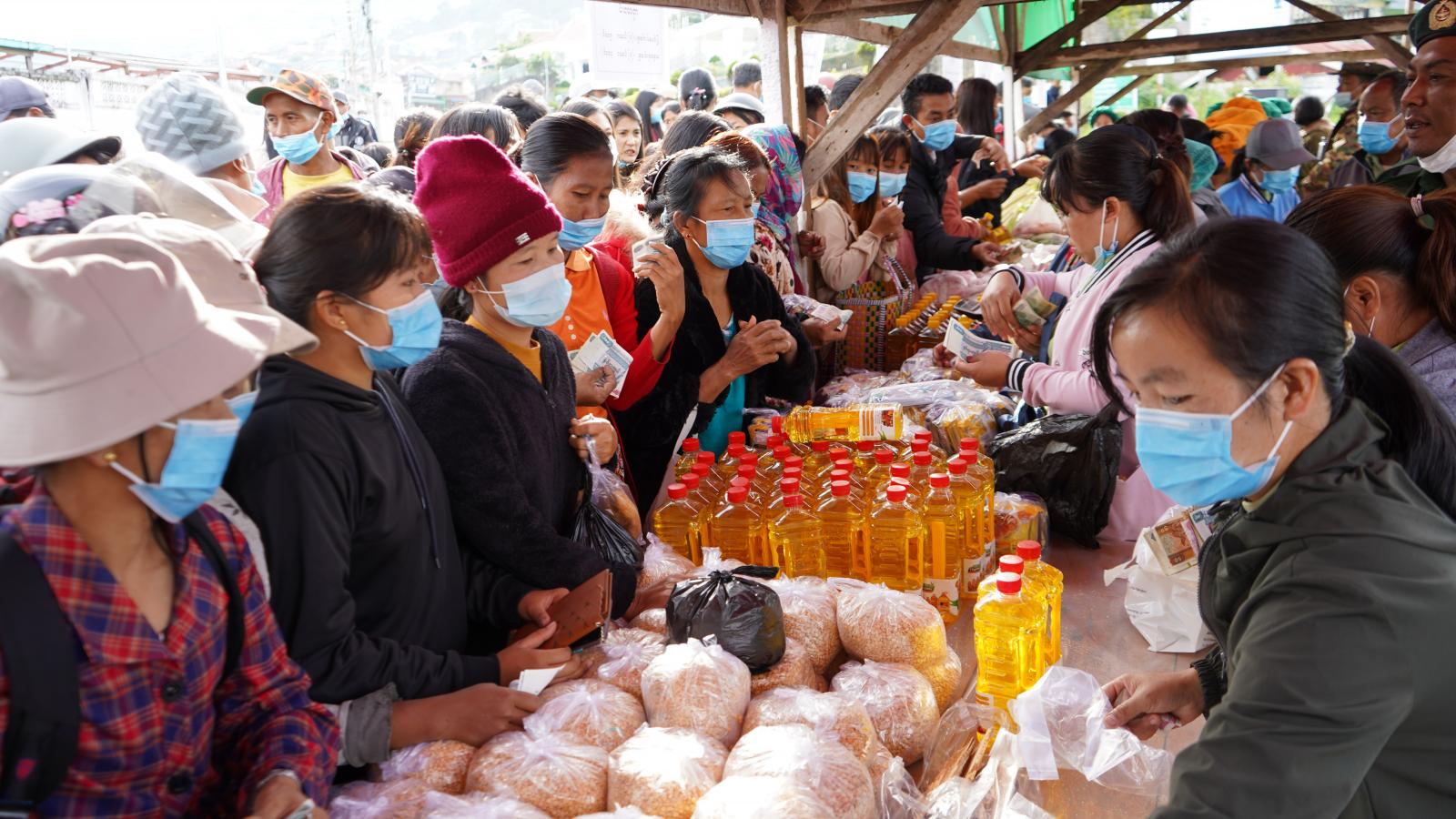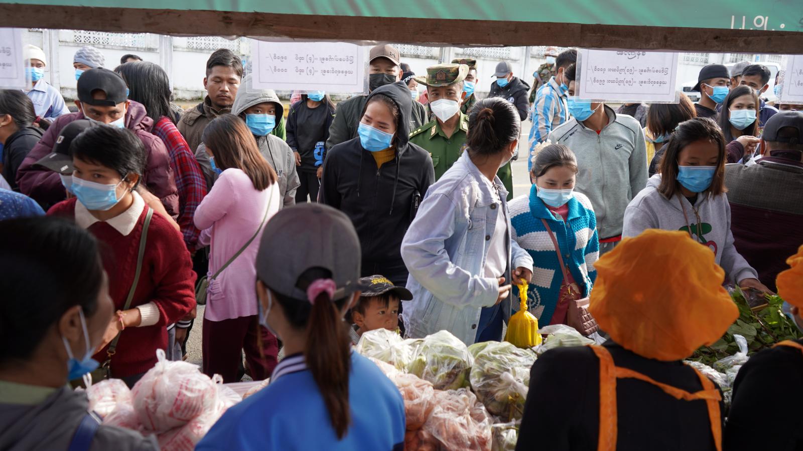 ထိုသို့ ရောင်းချရာတွင် ဆန်၊ ဆီ၊ ဆား၊ မာမီးခေါက်ဆွဲခြောက်၊ ကြက်သွန်နီ၊ ကြက်သွန်ဖြူ၊ အာလူး၊ ကုလားပဲ၊ ကြက်ဥ၊ အမဲသား၊ ဝက်သား၊ ကြက်သားနှင့် ဟင်းသီးဟင်းရွက် စသည့်အခြေခံ စားသောက် ကုန် (၁၇) မျိုးအပြင် ဟားခါးတပ်နယ်မှ တပ်ပိုင်နှင့် တစ်ပိုင်တစ်နိုင်စိုက်ပျိုးမွေးမြူရေးလုပ်ငန်းများမှ ထွက်ရှိသော အသား၊ ကြက်ဥနှင့် ဟင်းသီးဟင်းရွက်များကို ရောင်းချပေးလျက်ရှိရာ ဆန် (၂)ပြည် ၄၅၀၀/−၊ ပဲဆီ (၅၀)ကျပ်သား ၆၅၀၀/−၊ နေကြာဆီ ( ၅၀)ကျပ်သား ၅၅၀၀/−၊ ဆား (၃)ထုပ် ၁၀၀၀/−၊ ကြက်သွန်နီ (၁)ပိဿာ ၄၀၀၀/− ၊ ကြက်သွန်ဖြူ (၁)ပိဿာ ၄၅၀၀/−၊ အာလူး (၁)ပိဿာ ၂၅၀၀/−၊ ကုလားပဲ (၁)ပိဿာ ၄၀၀၀/−၊ ကြက်ဥ (၁၀)လုံး ၂၀၀၀/−၊ အမဲသား (၁)တွဲ ၈၀၀၀/−၊ ဝက်သား (၁)တွဲ ၉၅၀၀/−၊ ကြက်သား ( ၁ ) ကောင် ၉၅၀၀/−၊ ချဉ်ပေါင် ( ၂ ) စည်း ၄၀၀/−၊ ကစွန်းရွက် (၁) စည်း ၄၀၀/−၊ မုန်ညင်း (၁)စည်း ၄၀၀/−၊ ငရုတ်သီး စိမ်း ( ၁ ) ဗူး ၄၀၀/−စသည်ဖြင့် အပြင်ပေါက်စျေးထက် စျေးနှုန်းသက်သာစွာဖြင့် ရောင်းချပေးပြီး ဝယ်ယူသူ များပြားလျက်ရှိကြောင်း သိရသည်။