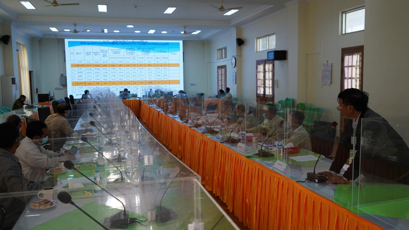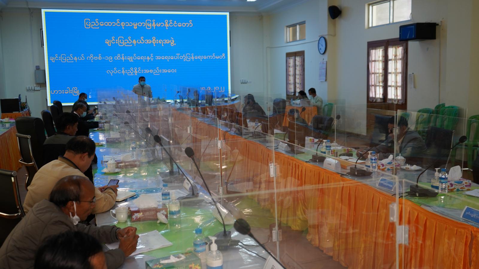 ဆက်လက်၍ ချင်းပြည်နယ်အစိုးရအဖွဲ့ရုံးမှ ဒုတိယညွှန်ကြားရေးမှူး ဦးမြင့်လွင်က ယခင်အပတ် အစည်းအဝေးဆုံးဖြတ်ချက်များနှင့် မြို့နယ်များမှ တင်ပြလာသည့် အုပ်ချုပ်ထောက်ပံ့မှုဆိုင်ရာများကို လည်းကောင်း၊ ပြည်နယ်ပြည်သူ့ကျန်းမာရေးနှင့် ကုသရေးဦးစီးဌာနမှူး ဒေါက်တာမြင့်မိုရ်စိုးက ကိုဗစ်−၁၉ ရောဂါ ကာကွယ်ထိန်းချုပ်ရေးလုပ်ငန်းများ ဆောင်ရွက်မှုအခြေအနေ၊ ၂၆−၉−၂၀၂၂ ရက်နေ့အထိ အသက် ၁၈ နှစ်နှင့်အထက် ကိုဗစ်−၁၉ ရောဂါကာကွယ်ဆေး ထိုးနှံပြီးစီးမှုအခြေအနေ၊ အသက် ၅ နှစ်မှ ၁၂ နှစ်အထိနှင့် အသက် ၁၂ နှစ်မှ ၁၈ နှစ်အထိ ကိုဗစ်−၁၉ ရောဂါကာကွယ်ဆေး ထိုးနှံပြီးစီးမှု ၊ အသက် ၁၈ နှစ်အထက် ပြည်သူများ Booster Dose ( 1 st Booster) ထိုးနှံပြီးစီးမှုနှင့် ထပ်ဆောင်း Booster Dose ( 2nd Booster ) ထိုးနှံပြီးစီးမှု ၊ အသက် ၁၂ နှစ်မှ ၁၈ နှစ် ကျောင်းသား ကျောင်းသူများ 1 st Booster Dose ထိုးနှံပြီးစီးမှု အခြေအနေ၊ မြို့နယ်အလိုက် ကိုဗစ်−၁၉ ရောဂါ ကာကွယ်ဆေးရရှိ၊ သုံးစွဲ၊ လက်ကျန်စာရင်းများ အခြေအနေများကို လည်းကောင်း၊ ဟားခါးမြို့ ပြည်သူ့ဆေးရုံအုပ် ဒေါက်တာမောင်မောင်ဝင်းက ကိုဗစ်−၁၉ ရောဂါပိုး ကူးစက်ခံရသူများအနက် သတ်မှတ်ချက်များနှင့် ကိုက်ညီသောသူများအား နေအိမ်တွင် သီးခြားထားရှိခြင်းနှင့် ပတ်သက်၍ လိုက်နာရမည့် လုပ်ငန်းလမ်းညွှန် (Version 1.2) ကိုလည်းကောင်း ရှင်းလင်းတင်ပြကြပြီး တက်ရောက်လာကြသည့် ဌာနဆိုင်ရာတာဝန်ရှိသူများက မြို့ဝင်၊ မြို့ထွက်များတွင် RDT Test Kit ဖြင့် စစ်ဆေးမှုအခြေအနေ ၊ Mask Campaign များပြုလုပ်မှု၊ အသိပညာလုပ်ငန်းများ စဉ်ဆက်မပြက် ဆောင်ရွက်မှုနှင့် လုပ်ငန်းလိုအပ်ချက်များကို ရှင်းလင်းတင်ပြကြသည်။
