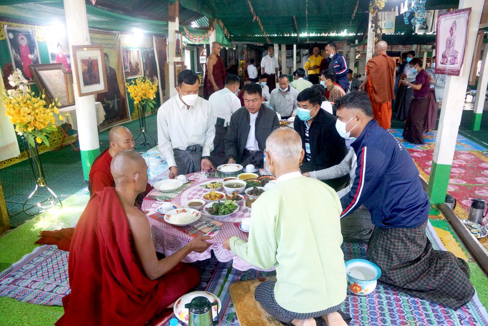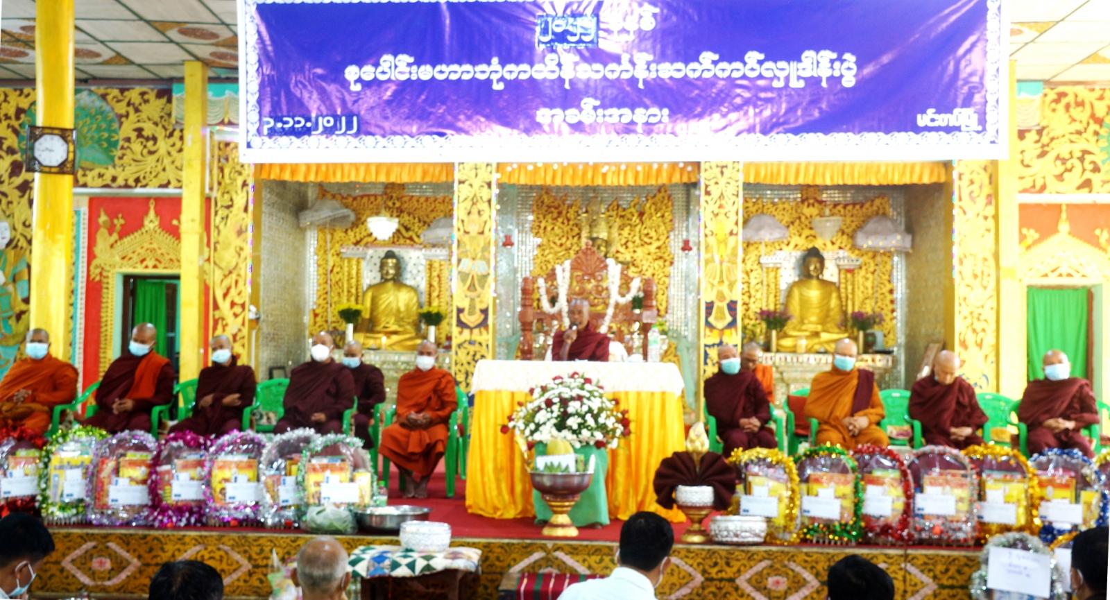 ဆက်လက်၍ မြို့နယ်သံဃနာယကအဖွဲ့ဥက္ကဋ္ဌ၊ ထေရဝါဒ သာသနာပြု ဗဟိုဆရာတော် အဂ္ဂမဟာသဒ္ဓမ္မ ဇောတိကဓဇ ဘဒ္ဒန္တခေမိန္ဒထံမှ လှူဒါန်းမှု အစုစုတို့အတွက် ရေစက်ချ အနုမောဒနာတရား နာယူ၍ ရေစက်သွန်းချ အမျှပေးဝေပြီး ဗုဒ္ဓသာသနံ စိရံတိဋ္ဌတု သုံကြိမ်ရွတ်ဆို ဆုတောင်း၍ အခမ်းအနားကို ရုပ်သိမ်းပြီး ကြွရောက်လာကြသော ဆရာတော်၊ သံဃာတော် အရှင်သူမြတ် တို့အား နေ့ဆွမ်း ဆက်ကပ်လှူဒါန်းခဲ့ကြသည်။ စုပေါင်းမဟာဘုံကထိန် သင်္ကန်းဆက်ကပ်လှူဒါန်းပွဲကို စစ်နယ်မြေမှူး ဗိုလ်မှူးကြီး အောင်မြတ်ထွန်း၏ ဦးဆောင်မှုဖြင့် ခရိုင်/မြို့နယ် ဌာနဆိုင်ရာဝန်ထမ်းများနှင့် မြို့မိမြို့ဖများ စုပေါင်း၍ ဆောင်ရွက်ခြင်းဖြစ်ပြီး ဝတ္ထုငွေနှင့် ပစ္စည်းများ၏ စုစုပေါင်း တန်ဖိုးငွေမှာ ကျပ် (၅၃၆၀၀၀၀/-) ဖြစ်ကြောင်း သိရသည်။