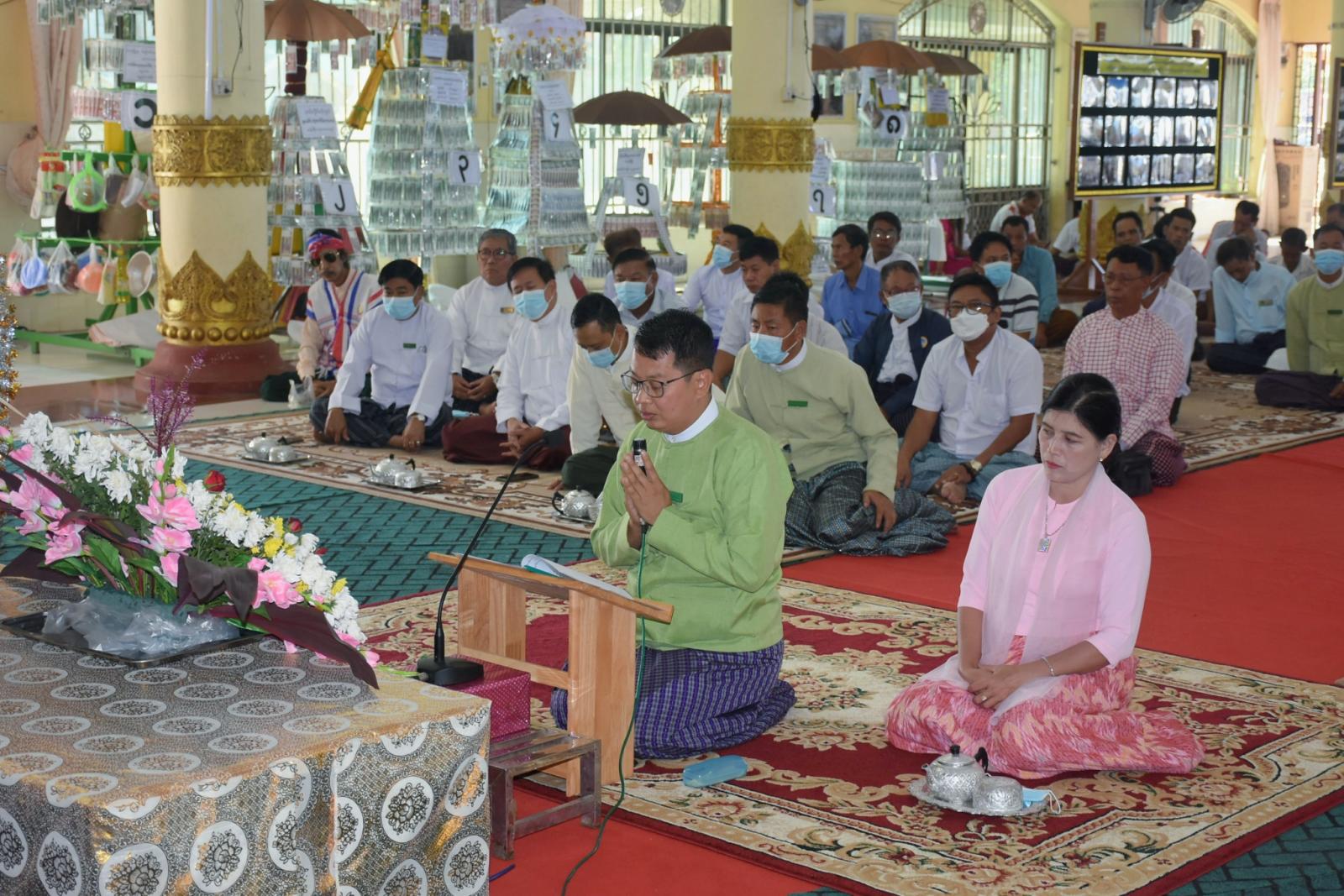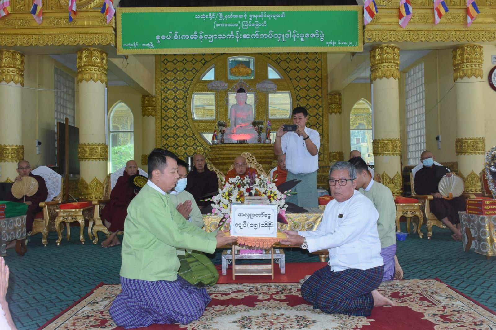 ဆက်လက်၍ ခရိုင်စီမံအုပ်ချုပ်ရေးအဖွဲ့ဥက္ကဋ္ဌက ယခုနှစ်က ထိန်ခင်းရန် အလှည့်ကျသည့် နန်းခဲရပ်ကွက်၊ အဘယသုခကျောင်းတိုက် ဆရာတော်ထံ ကထိန်လျာ ဉာတ်သင်္ကန်းတော်ကို ဆပ်ကပ်လှူဒါန်းပေးပြီး ရွှေစာရံစေတီတော် ဘဏ္ဍာတော်ထိန်းဂေါပကအဖွဲ့ထံ စေတီတော်မြတ်ကြီး လုံးတော်ပြည့်ရွှေ သင်္ကန်း ကပ်လှူရေး ငွေကျပ်(၁၅)သိန်း ပေးအပ်လှူဒါန်းသည်။