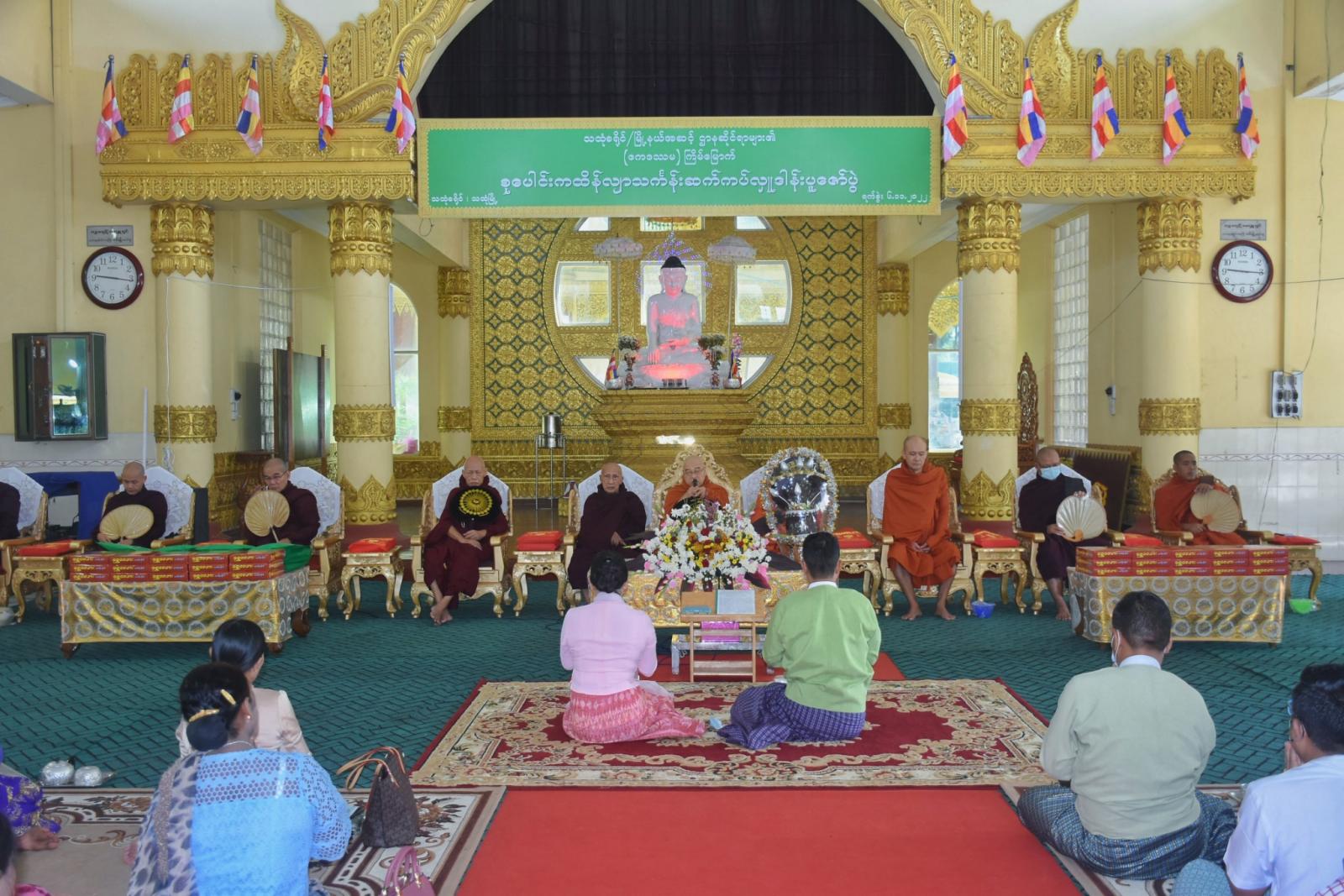 ရှေးဦးစွာ သဒ္ဓမ္မဇောတိကာရာမကျောင်းတိုက်ကြီး၏ ဦးစီးပဓာနနာယက၊ အဂ္ဂမဟာပဏ္ဍိတ နိုင်ငံတော်ဗဟိုသံဃဝန်ဆောင်၊ ပိဋကတ္တရပါရဂူ ဘဒ္ဒန္တသုမနာဘိဝံသထံမှ တက်ရောက်လာကြသည့် ဧည့်ပရိတ်သတ်အပေါင်းတို့က သီလ ခံယူဆောက်တည်ကြပြီး၊ ခရိုင်စီမံအုပ်ချုပ်ရေးအဖွဲ့ဥက္ကဋ္ဌ ဦးလှိုင်ထွန်းက စုပေါင်းကထိန်လျာသင်္ကန်းဆပ်ကပ်လှူဒါန်းရခြင်းနှင့်စပ်လျဉ်း၍ သာသနာရေးဆိုင်ရာ ဆောင်ရွက်ချက်များကို တင်ပြလျှောက်ထားသည်။