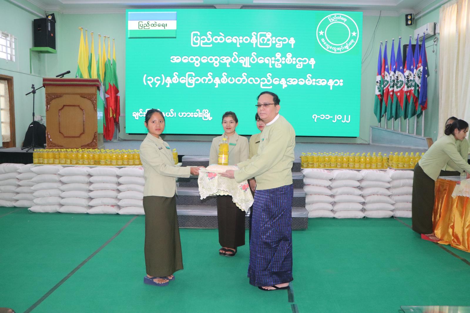ထို့နောက် အထွေထွေအုပ်ချုပ်ရေးဦးစီးဌာန၏ သမိုင်းကြောင်းနှင့် ဆောင်ရွက်ချက်မှတ်တမ်းအား Video Clip ဖြင့် ပြသပြီး ပြည်နယ်အထွေထွေအုပ်ချုပ်ရေးဦးစီးဌာနရုံး ဝန်ထမ်းများအား ပြည်နယ် အုပ်ချုပ်ရေးမှူး ဦးမောင်မောင်ဆန်း၊ ညွှန်ကြားရေးမှူးများနှင့် ဒုတိယညွှန်ကြားရေးမှူးများက ဆန်၊ ဆီနှင့် စားသောက်ကုန်များ ထောက်ပံ့ပေးအပ်ကြသည်။