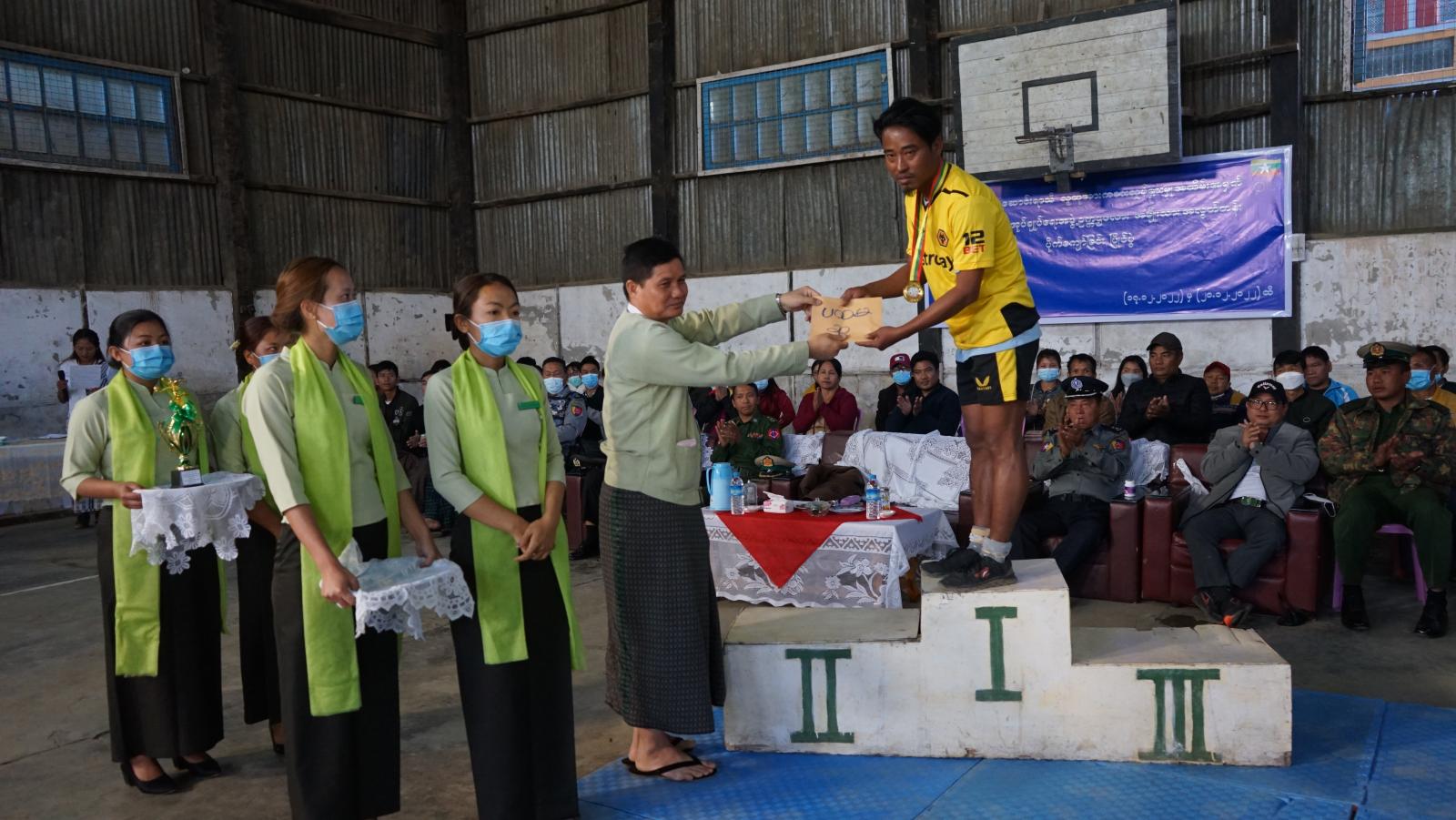 ထို့နောက်ဆုပေးပွဲအခမ်းအနားကို ဆက်လက်ကျင်းပရာ နောက်ထိန်းအကောင်းဆုံးအား ကစားသမားဆုကို မြို့နယ်စီမံအုပ်ချုပ်ရေးအဖွဲ့ အတွင်းရေးမှူးယာယီရဲမှူး မျိုးဝင်းကလည်းကောင်း၊ ပင့်ထောက်အကောင်းဆုံး အားကစားသမားဆုကို ခရိုင်အားက စားနှင့်ကာယပညာဦးစီးဌာန လက်ထောက်ညွှန်ကြားရေးမှူး ဦးမာန်မနားကလည်းကောင်း၊ ရိုက်ခုတ် အကောင်းဆုံးအားကစား သမားဆုကိုမြို့နယ် စီမံအုပ်ချုပ်ရေးအဖွဲ့အဖွဲ့(၁) ဗိုလ်မှူး ညီညီအောင်ကလည်းကောင်း၊ ပြိုင်ပွဲတစ် လျောက်အကောင်းဆုံး အားကစား သမားဆုကိုမြို့နယ် စီမံအုပ်ချုပ်ရေးအဖွဲ့ဥက္ကဋ္ဌဦးကောင်းမြတ်ထွန်း ကလည်းကောင်းဆုများ အသီးသီးချီးမြှင့်ကြသည်။