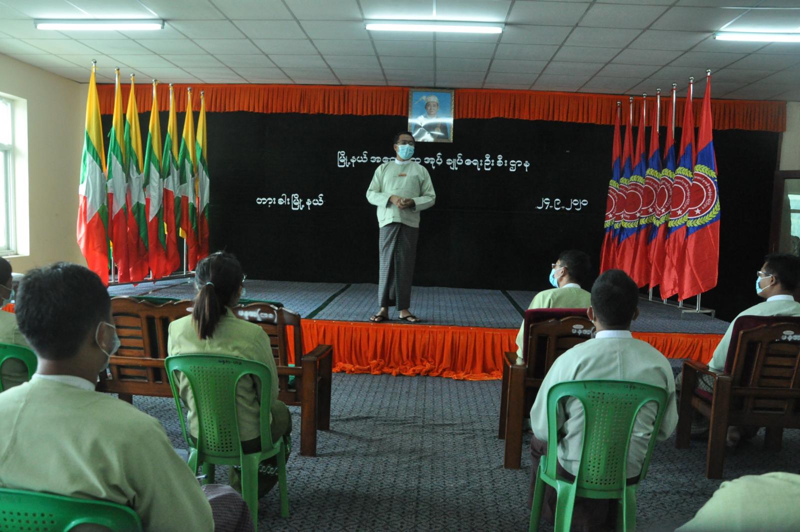 ဟားခါးမြို့နယ်အတွင်းရှိ အထွေထွေအုပ်ချုပ်ရေး ဦးစီးဌာန၊ ရပ်ကွက်၊ ကျေးရွာအုပ်စု စာရေးဝန်ထမ်းများအား အထွေထွေ အုပ်ချုပ်ရေးဦးစီးဌာန(ရုံးချုပ်) မှ ထောက်ပံ့ငွေနှင့် ကျန်းမာရေးသုံးပစ္စည်းများ ထောက်ပံ့ပေးအပ်ခြင်းကို ယမန်နေ့ညနေ ၄ နာရီက ဟားခါးမြို့ မြို့နယ်စုပေါင်းရုံး အစည်းအဝေးခန်းမ၌ ကျင်းပရာ ဟားခါးမြို့နယ်အုပ်ချုပ်ရေးမှူး ဦးမြင့်ဦးက ထောက်ပံ့ပေးအပ်ရခြင်း နှင့် ပတ်သက်၍ ရှင်းလင်း ပြောကြားသည်။