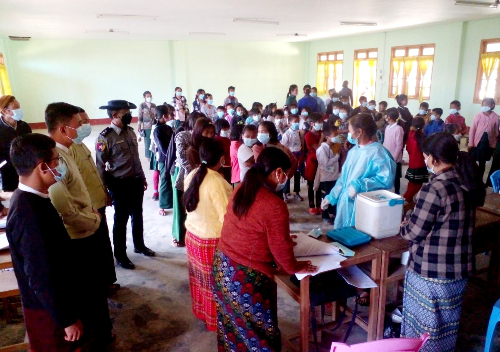 ချင်းပြည်နယ်တီးတိန်မြို့၌ အသက် ၁၂ နှစ်မှ ၁၈ နှစ်ကြား ကျောင်းသား/ကျောင်းသူများအား ကိုဗစ်-၁၉ ကာကွယ်ဆေး တတိယအကြိမ် Booster Sinoparm ထိုးနှံခြင်းကို အ.ထ.က(၁) စံကိုက်ညီကျောင်းဆောင်၌ ဇန်နဝါရီ ၂၄ ရက်နေ့က ပြုလုပ်ကြောင်း သိရသည်။