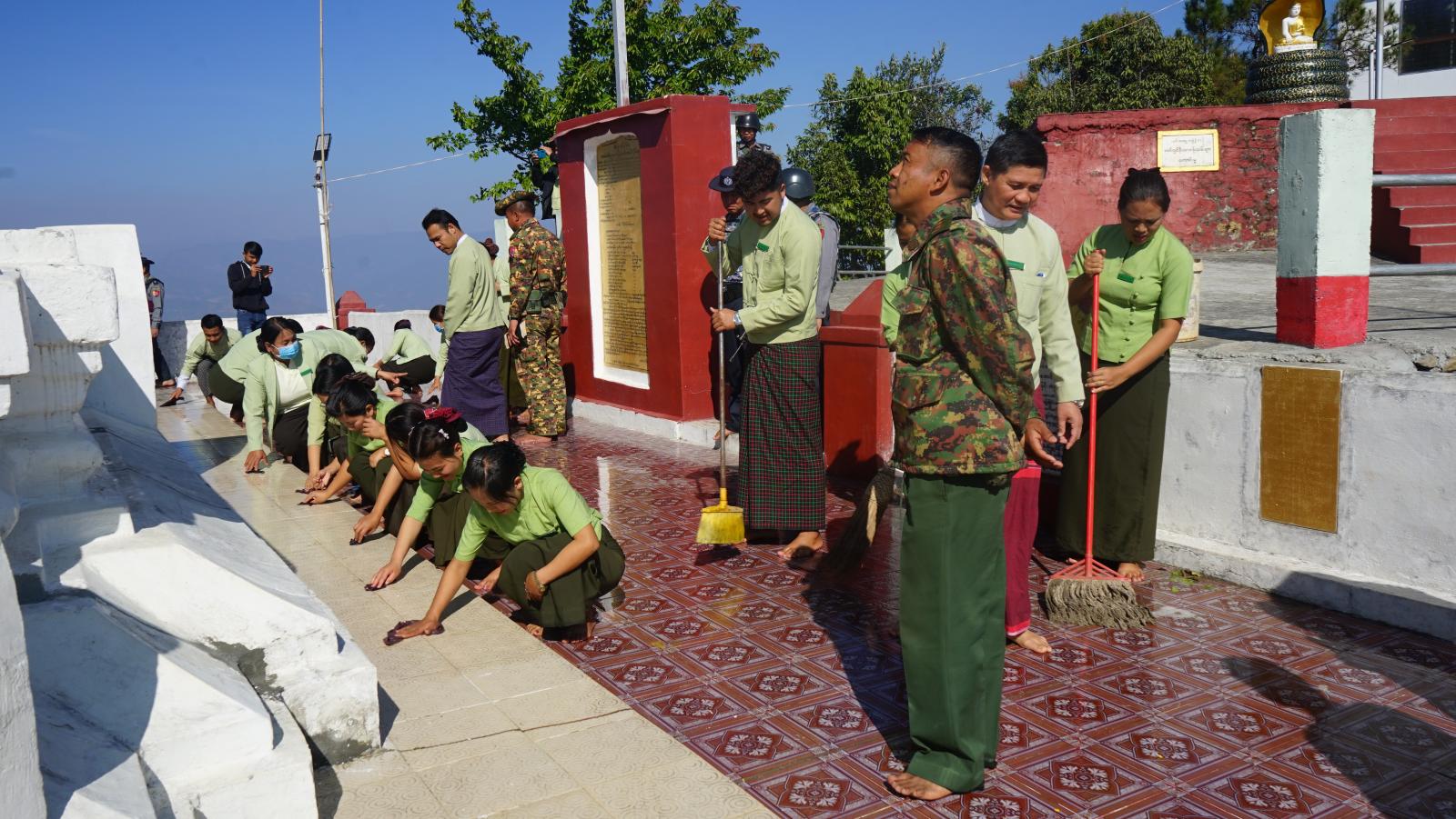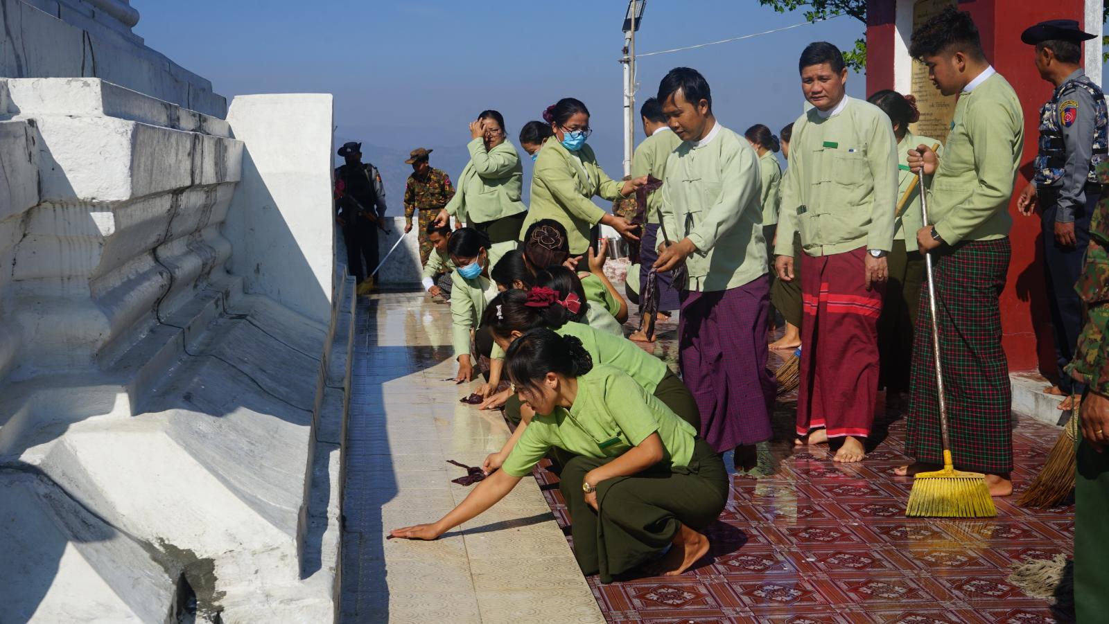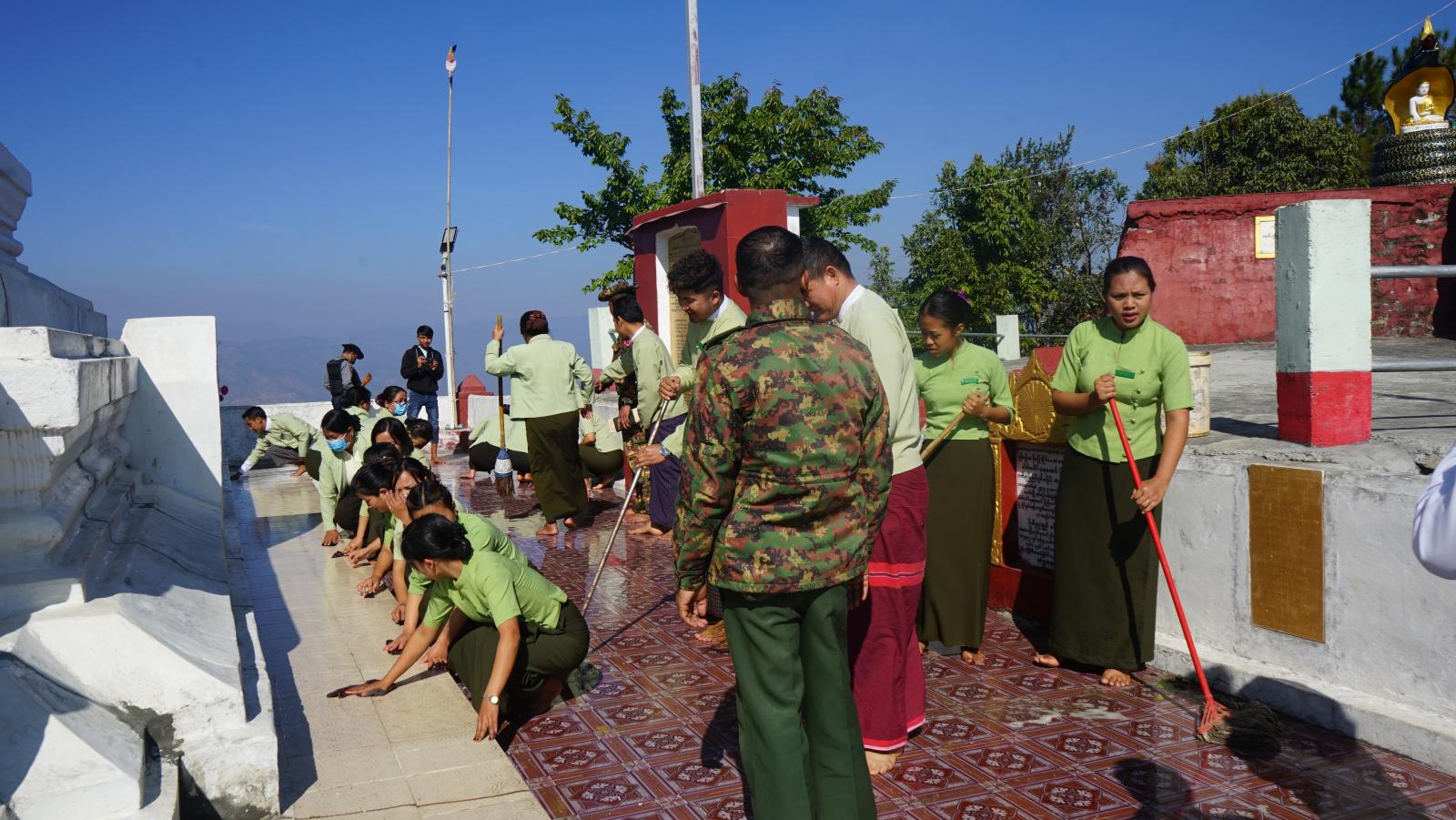 ဆက်လက် ခရိုင်စီမံအုပ်ချုပ်ရေးအဖွဲ့ဥက္ကဋ္ဌနှင့်အဖွဲ့ဝင်များ၊ မြို့နယ်စီမံအုပ်ချုပ်ရေးအဖွဲ့ဝင်များနှင့် ဖလမ်းမြို့ ခရိုင်/မြို့နယ်ဌာနဆိုင်ရာ ဗုဒ္ဓဘာသာဝင်များသည် မွန်းလွဲ ၂ နာရီမှညနေ ၁၅ နာရီအထိ ဖလမ်းမြို့၊ ကျင်မွာလ်ရပ်ကွက်ရှိ ရန်ပြေမာန်ပြေနိုင်ငံအေး အောင်တော်မူဓာတ်ပေါင်းစု ဆုတောင်းပြည့်စေတီတော်မြတ်ကို ပြည်သူများစိတ်အေးချမ်း သာစွာဖူးမြှော်ကြည်ညိုနိုင်ရန် အတွက်စေတီတော်ရင်ပြင်တော် ဆေးကြောခြင်း၊ တန်စောင်းနှင့်စေတီတော်ပတ်ဝန်းကျင်အား စုပေါင်းသန့်ရှင်းရေး ကုသိုလ်ယူဆောင်ရွက်ခဲ့ကြကြောင်း သိရသည်။