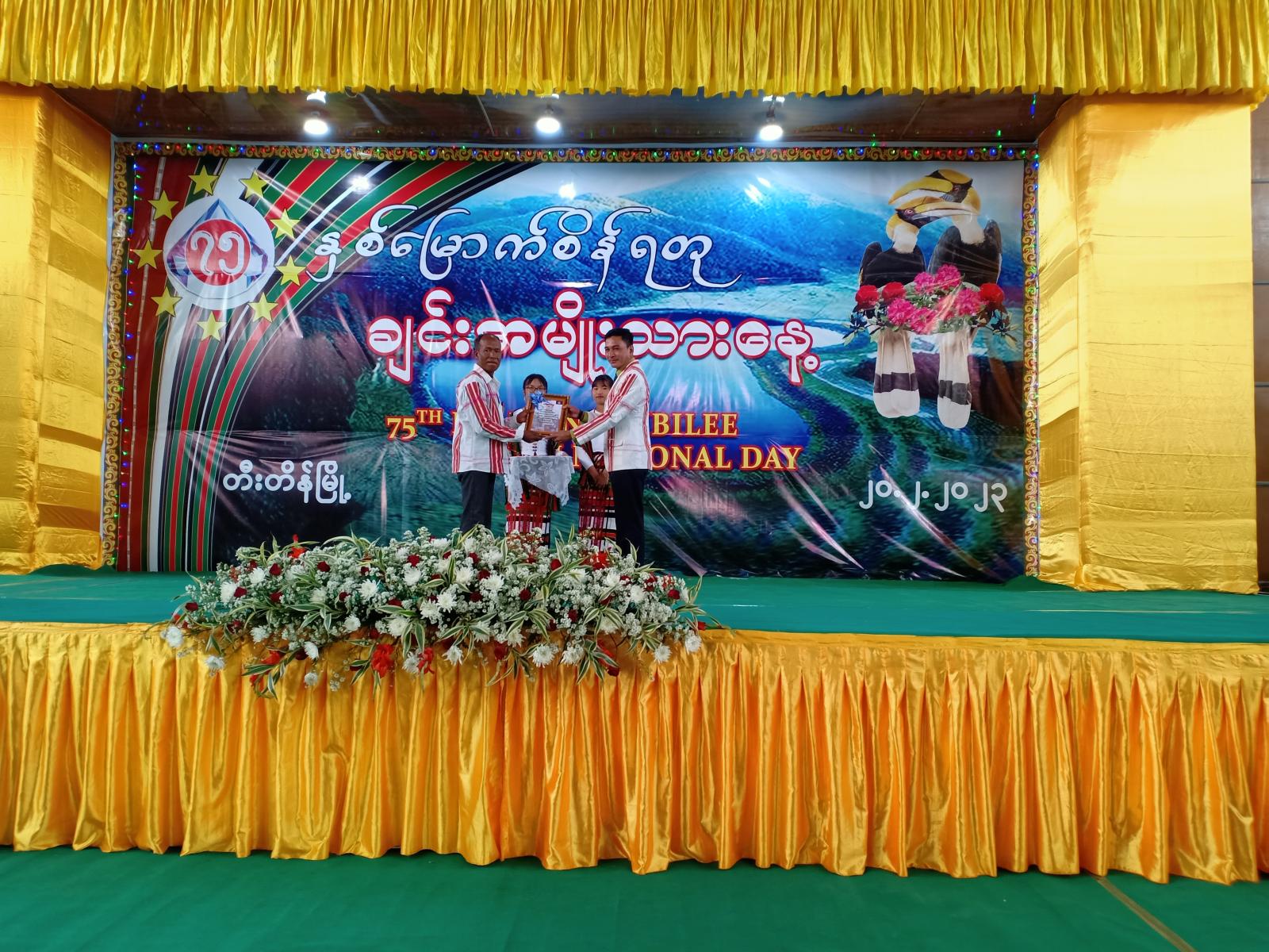 ထို့နောက် (၇၅) နှစ်မြောက် စိန်ရတုချင်းအမျိုးသားနေ့ အခမ်းအနားကျင်းပပြုလုပ်ရေးအတွက် အလှူရှင်များနှင့် မြို့ဖွံ့ဖြိုးတိုးတက်ရေးအတွက် မြေနေရာအလှူရှင်အား တာဝန်ရှိသူများက ဂုဏ်ပြုမှတ်တမ်းလွှာများ ပေးအပ်ခဲ့ကြသည်။