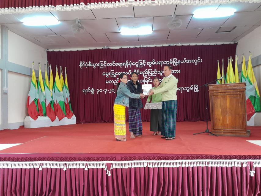 ဆက်လက်၍ မြို့နယ်စီမံအုပ်ချုပ်ရေးအဖွဲ့ဥက္ကဋ္ဌ ဦးခင်မောင်မြင့်က မွေးမြူရေးမြစိမ်းရောင် စီမံကိန်း ကြီးကြပ်မှုကော်မတီများထံ အရင်းမပျောက်မတည်ငွေ သိန်း(၂၀၀)ကျပ်ကို လွှဲပြောင်းပေးအပ်ရာ ကော်မတီများက မွေးမြူရေးလုပ်ကိုင်မည့် ပြည်သူစုစုပေါင်း (၆၁)ဦးတို့အား အရင်းမပျောက်မတည်ငွေများကို ဆက်လက်ဖြန့်ဝေထုတ်ချေးပေးခဲ့သည်။ အဆိုပါ အခမ်းအနားသို့ မြို့နယ်စီမံ အုပ်ချုပ်ရေးအဖွဲ့ဥက္ကဋ္ဌ ဦးခင်မောင်မြင့်နှင့် အဖွဲ့ဝင်များ၊ ဌာနဆိုင်ရာဝန်ထမ်းများ၊ မွေး/ကုဦးစီးဌာနမှ တာဝန်ရှိသူများ၊ ပြည်သူများ တက်ရောက်ခဲ့ကြောင်း သိရသည်။