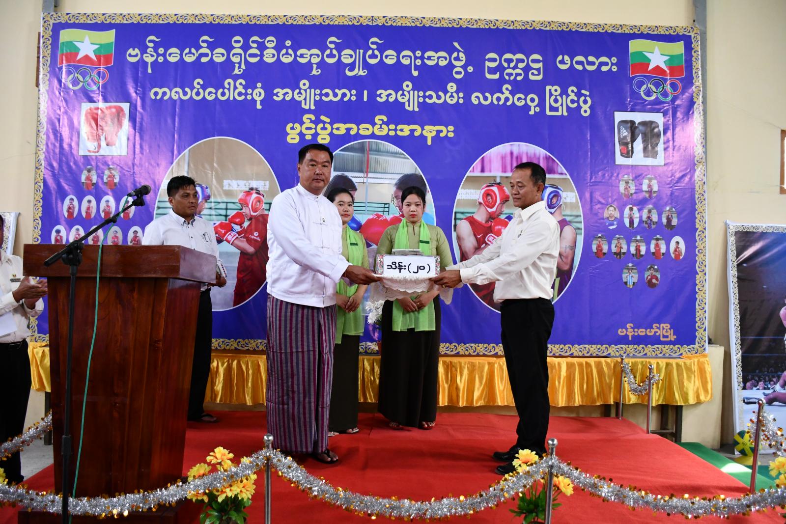ယင်းနောက် ကချင်ပြည်နယ်ဝန်ကြီးချုပ် သီရိပျံချီ ဦးခက်ထိန်နန်မှ လက်ဝှေ့ပြိုင်ပွဲအတွက် ထောက်ပံ့သည့် ငွေကျပ်သိန်း (၂၀) အား တိုင်းရင်းသားရေးရာဝန်ကြီး ဦးကျော်မင်းခိုင်က ပေးအပ်ရာ ဗန်းမော်ခရိုင်အားကစားနှင့်ကာယပညာဦးစီးဌာန ခရိုင်ဦးစီးမှူး ဦးကြည်စိုးက လက်ခံရယူခဲ့သည်။ ဆက်လက်၍ တိုင်းရင်းသားရေးရာဝန်ကြီးက ပြိုင်ပွဲတွင်ပါဝင်တီးခတ်ပေးသည့် အမှတ် (၄) အခြေခံပညာအထက်တန်းကျောင်းမှ ဘင်ခရာတပ်ဖွဲ့အား ဂုဏ်ပြုငွေပေးအပ်ခြင်း နှင့် လက်ဝှေ့ကလပ်များအား အားကစားပစ္စည်းများ ထောက်ပံ့ပေးအပ်ခြင်းများ ပြုလုပ်ခဲ့ပြီး အားကစားသရုပ်ပြတင်ဆက်ကာ ပြိုင်ပွဲစတင်ကျင်းပခဲ့သည်။