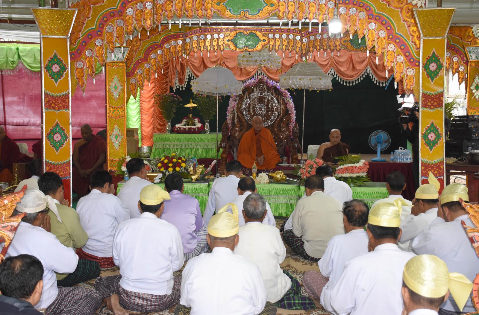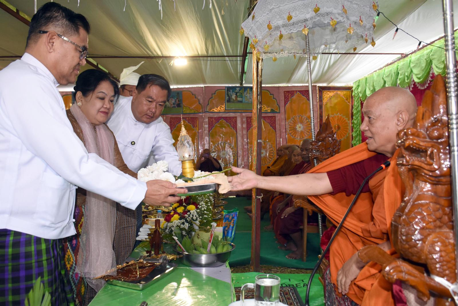 ရှေးဦးစွာ ရွှေထီးတော်၊ ငှက်မျက်နားတော်၊ ရွှေကြုတ်တော် ဆက်ကပ်လှူဒါန်းပွဲ အခမ်းအနားကို ကျင်းပရာအခမ်းအနားကို နမောတဿ(၃)ကြိမ်ရွတ်ဆို ဘုရားကန်တော့ဖွင့်လှစ်ပြီး မြစ်ကြီးနားမြို့ ဓမ္မရက္ခိတဝန်းသိုကျောင်းတိုက် ဦးစီးပဓာနနာယက၊ ပြည်နယ်သံဃနာယကအဖွဲ့ အကျိုးဆောင် ဆရာတော် အဂ္ဂမဟာပဏ္ဍိတ ဘဒ္ဒန္တကေတုမာလာ အမှူးပြုသော ဆရာတော်၊ သံဃာတော်ထံမှ ပြည် နယ်ဝန်ကြီးချုပ်နှင့်ဇနီး ဒေါ်နန်ဆိုင်း၊ ပြည်နယ်တရားလွှတ်တော်တရားသူကြီးချုပ်၊ ပြည်နယ်ဝန်ကြီးများနှင့် ၎င်းတို့ဇနီးများ၊ အလှူရှင်များနှင့် တက်ရောက်လာကြသည့် ဧည့်ပရိတ်သတ်များက (၉)ပါး သီလခံယူဆောက်တည်ကြသည်။