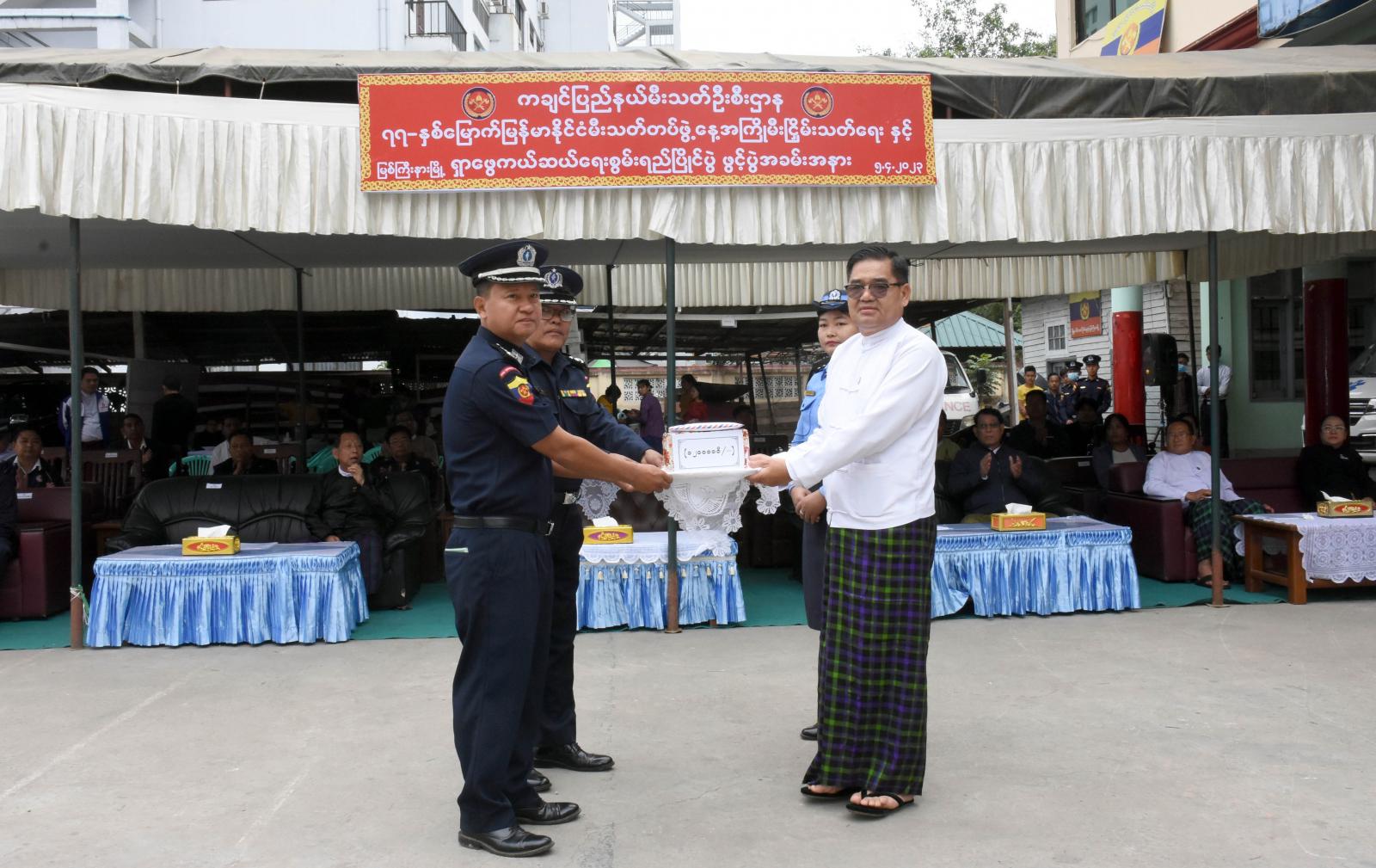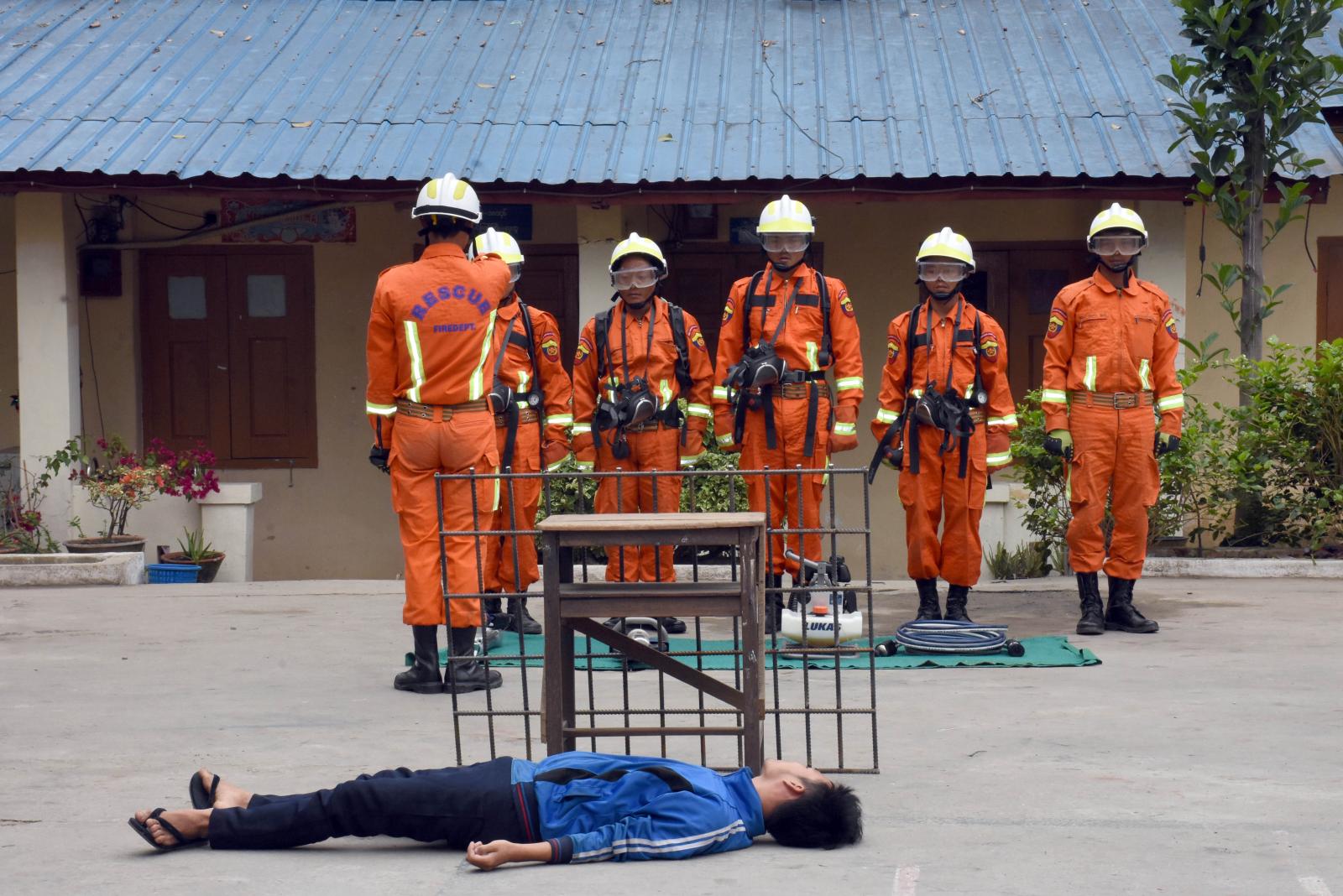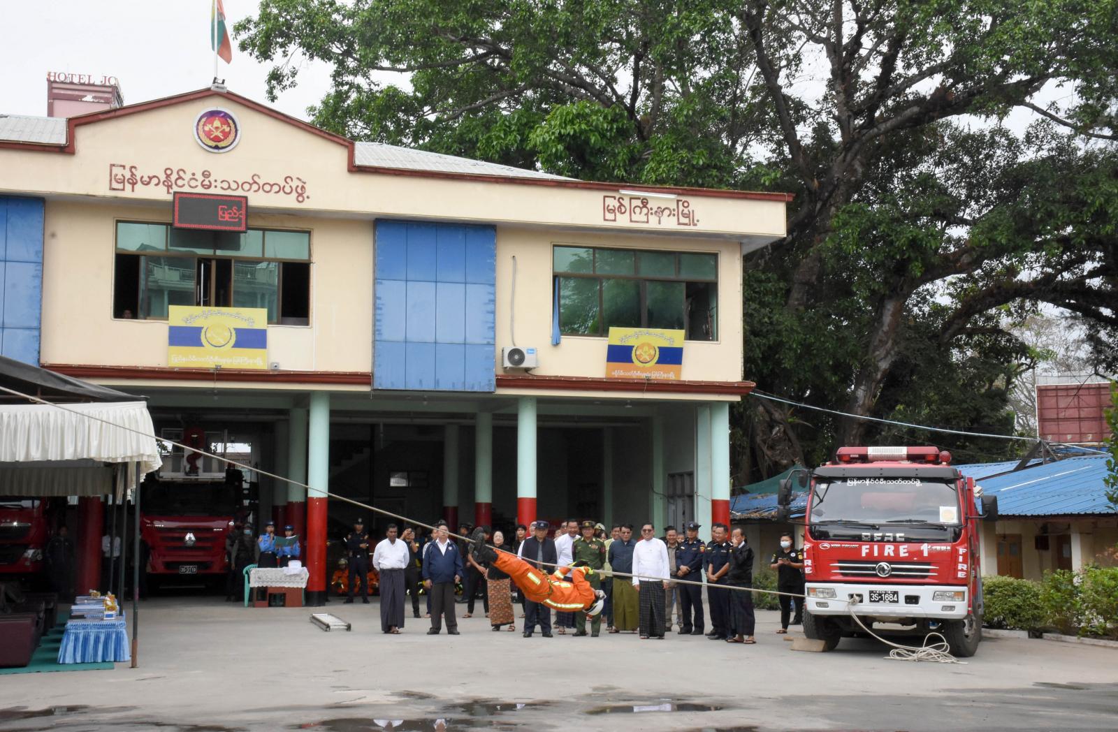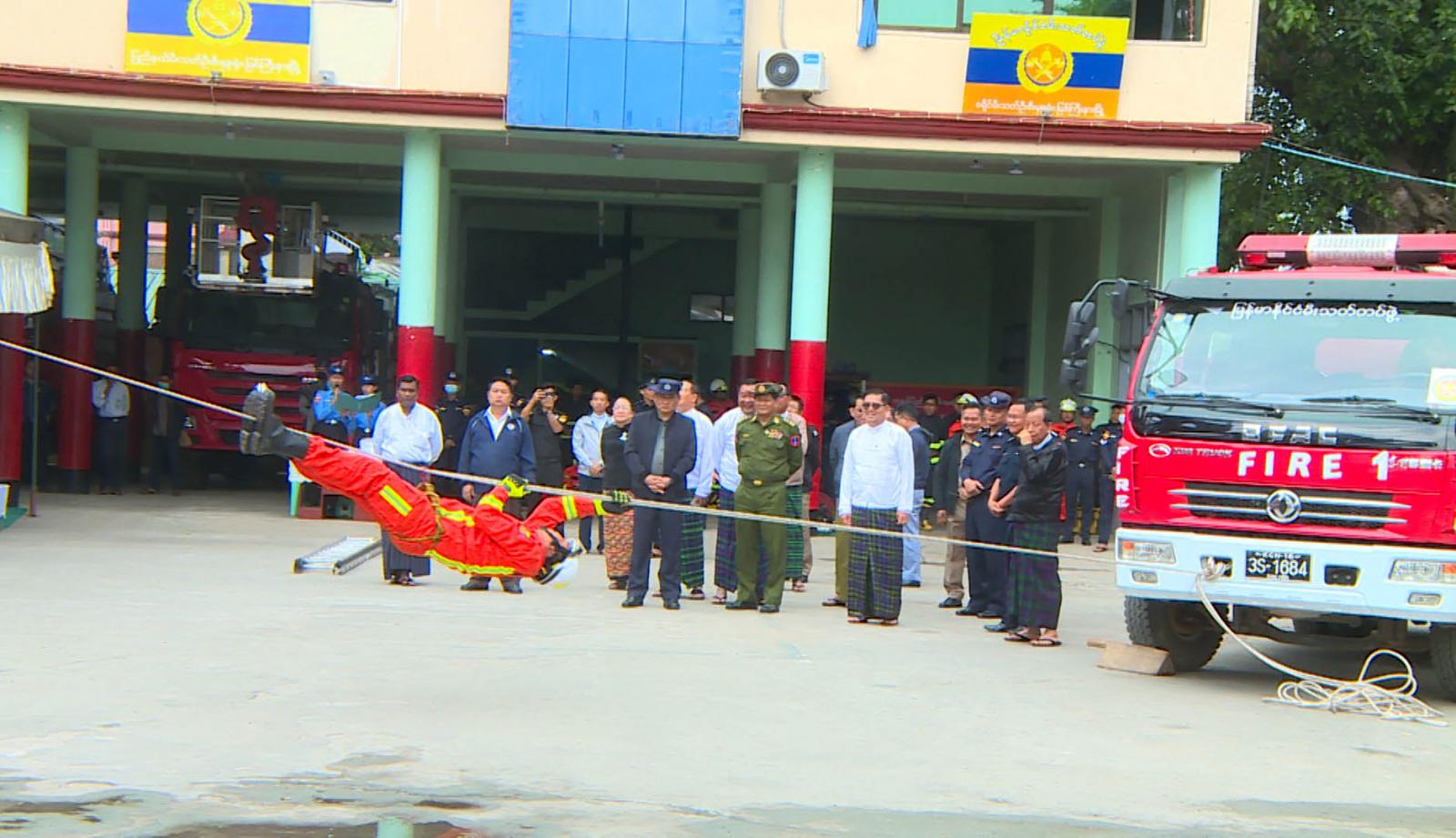 ဆက်လက်၍ မီးသတ်ရုံးဝင်းအတွင်း မီးသတ်တပ်ဖွဲ့ဝင်များ၏ အဖွဲ့လိုက်မီးငြှိမ်းသတ်ရေးခြင်း၊ အဖွဲ့လိုက် မီးသတ်စက်ဖြင့် အထပ်မြင့်အဆောက်အဦအား မီးငြှိမ်းခြင်း၊ အဖွဲ့လိုက် Hydraulic Tools များအသုံးပြု၍ ရှာဖွေကယ်ဆယ်ခြင်း၊ တစ်ဦးချင်း မီးသတ်ပိုက်လိပ်ဖြန့်ခြင်းနှင့် တစ်ဦးချင်း ရှာဖွေကယ်ဆယ်ခြင်း (Brave Heart) စွမ်းရည်စသည့်တို့ဖြင့် သရုပ်ပြသမှုကို ကြည့်ရှုအားပေးခဲ့ကြပြီး ပြည်နယ်ဝန်ကြီးချုပ် မီးသတ်တပ်ဖွဲ့ဝင်များအတွက် ထောက်ပံ့ငွေကျပ် (၁၂)သိန်းကို ထောက်ပံ့ပေး အပ်ခဲ့သည်။