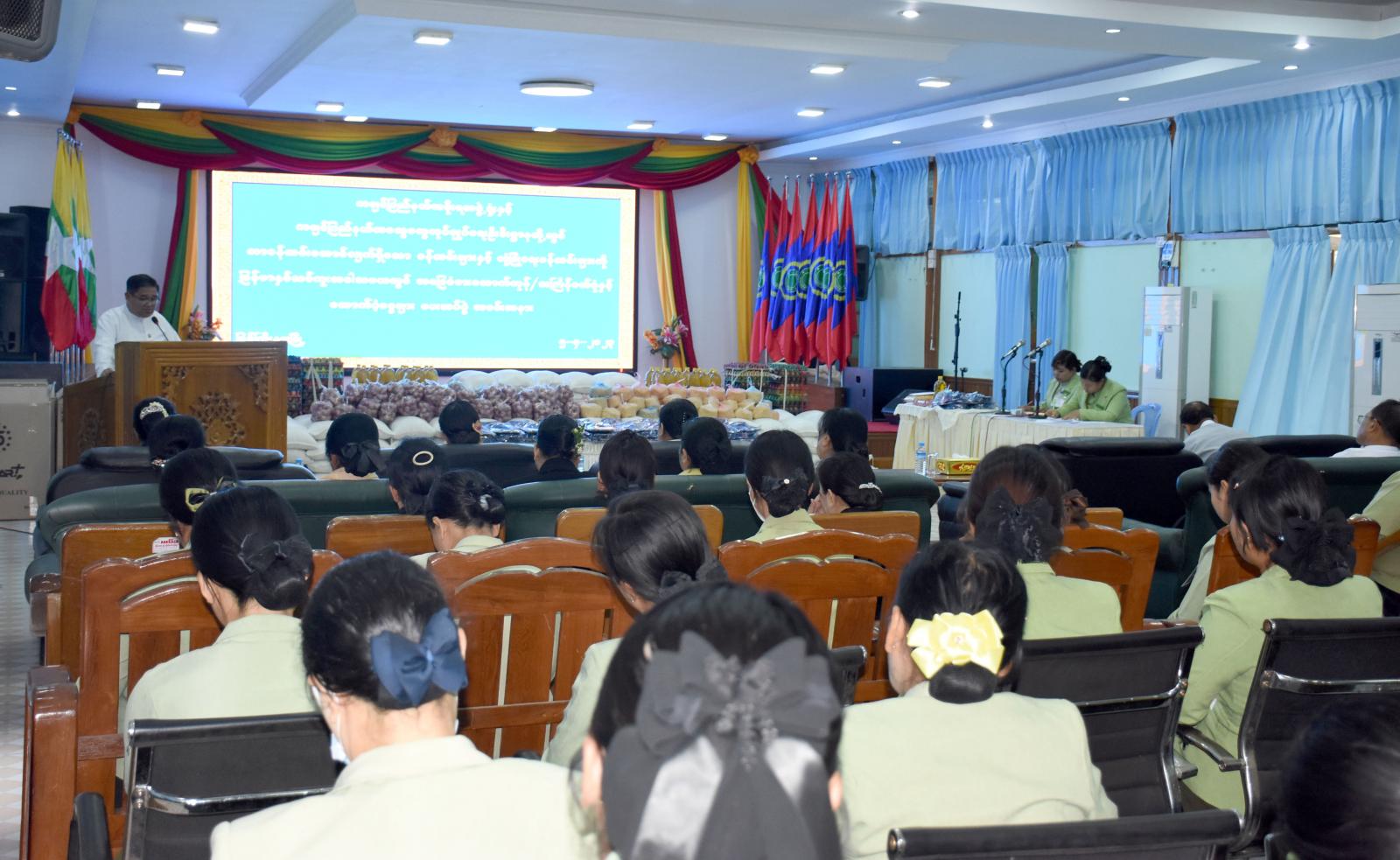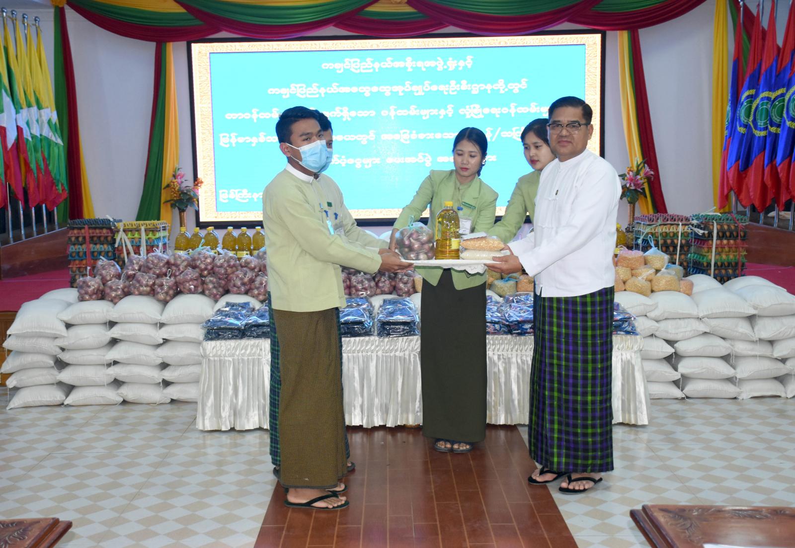 ယင်းနောက် ထောက်ပံ့ပစ္စည်းများကို ပေးအပ်ရာ ပြည်နယ်ဝန်ကြီးချုပ်နှင့် ဇနီးဒေါ်နန်ဆိုင်း၊ ပြည်နယ်တရားလွှတ်တော်တရားသူကြီးချုပ်နှင့်ဇနီး၊ ပြည်နယ်ဝန်ကြီးများနှင့် ၎င်းတို့၏ ဇနီးများ၊ ပြည်နယ်ဥပဒေချုပ်၊ ပြည်နယ်အစိုးရအဖွဲ့ရုံးနှင့် ပြည်နယ်အထွေထွေအုပ်ချုပ်ရေးဦးစီးဌာနတို့တွင် တာဝန်ထမ်းဆောင်နေသော အရာထမ်း၊ အမှုထမ်းများ၊ လုံခြုံရေးတာဝန်ထမ်းဆောင်နေသော တပ်မတော်သားများနှင့် ရဲတပ်ဖွဲ့ဝင်များ၊ ကိုဗစ်-၁၉ထိန်းချုပ်ရေးနှင့် အရေးပေါ်တုံ့ပြန်ရေးကော်မတီ ရုံး၊ အဂတိလိုက်စားမှုတိုက်ဖျက်ရေးအဖွဲ့၊ နိုင်ငံ့စီးပွားမြှင့်တင်ရေးရုံးအဖွဲ့၊ သတင်းနှင့်မှတ်တမ်းအဖွဲ့ နှင့် ဧရာဝတီဧည့်ရိပ်သာတာဝန်ထမ်းဆောင်နေသော ဝန်ထမ်းစုစုပေါင်း (၃၆၇)ဦးတို့အတွက် တစ်ဦး လျှင် ဆန်(၆)ပြည်၊ ကြက်ဥ (၃၀)လုံး၊ စားသုံးဆီ၊ ကြက်သွန်နီ၊ ကုလားပဲ (၁)ပိဿာစီနှင့် သင်္ကြန် ထောက်ပံ့ငွေကျပ် ၁၀၀၀၀ စီ၊ သင်္ကြန်ဝတ်စုံများဖြင့် စုစုပေါင်းပစ္စည်းနှင့် ငွေသားတန်ဖိုးကျပ် ၃၀၀၁၃၀၀၀(ကျပ်သိန်းသုံးရာတစ်သောင်းသုံးထောင်)ကို အသီးသီးထောက်ပံ့ပေးအပ်ကြရာ ဝန်ထမ်း တစ်ဦးက ကျေးဇူးတင်စကားပြန်လည်ပြောကြားခဲ့ကြောင်း သိရှိရသည်။