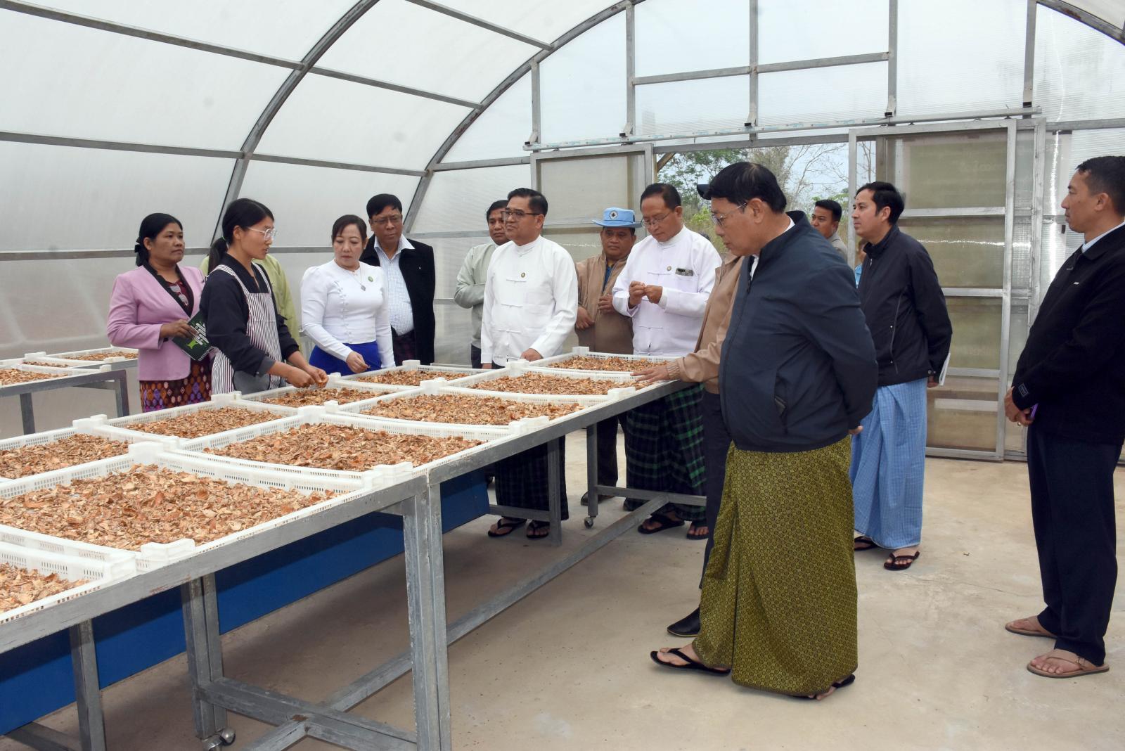အလားတူ ကချင်ပြည်နယ်ဝန်ကြီးချုပ်သည် နိုင်ငံ့စီးပွားမြှင့်တင်ရေး ရန်ပုံငွေဖြင့် စိုက်ပျိုးမွေး မြူရေးဆောင်ရွက်သော ပြည်နယ်အဆင့်ကျေးရွာစီမံကိန်းကြီးကြပ်မှုကော်မတီအဖွဲ့ဝင်များနှင့်အတူ ဧပြီ ၅ ရက် ညနေ ၃ နာရီခွဲက မြစ်ကြီးနားမြို့ နန်ကျင်ကျေးရွာအတွင်း နိုင်ငံ့စီးပွားမြှင့်တင်ရေး ရန်ပုံငွေကျပ်သိန်း (၁၀၀)ဖြင့် ပူတာအိုဒေသထွက်သီးနှံများအား အဆင့်မြင့်စားသောက်ကုန်ထုတ် လုပ်သည့်လုပ်ငန်းဆောင်ရွက်လျက်ရှိသည့် ကဆန်ထီ စိုက်ပျိုးရေးနှင့်အထွေထွေစီးပွားရေးလုပ်ငန်း သမဝါယမအသင်းလီမိတက်၌ ဒေသထွက်ဆနွင်းထုတ်ကုန်များ၊ သစ်ကြားသီး၊ အမေရိကန်သံပုရာ၊ ဂရိတ်ဖုသီးစသည့်တို့အား အဆင့်မြင့်စားသောက်ကုန်ထုတ်လုပ်နေမှု အခြေအနေတို့ကို အသင်းဥက္ကဋ္ဌ၊ အသင်းသူ/အသင်းသားများ၏ လိုက်လံရှင်းလင်းတင်ပြမှုကို လှည့်လည်ကြည့်ရှုစစ်ဆေးပြီး ကုန်ကြမ်းရရှိမှု၊ ဈေးကွက်တင်ပို့နိုင်မှု အခြေအနေများကို မေးမြန်းဆွေးနွေးခဲ့ကြပြီး လိုအပ်သည့် နည်းပညာပံ့ပိုးမှု၊ FDA ခွင့်ပြုမိန့်နှင့် အသင်းအဖွဲ့လိုင်စင်ရရှိရေး ညှိနှိုင်းပေါင်းစပ်ဆောင်ရွက်ပေးခဲ့ သည်။