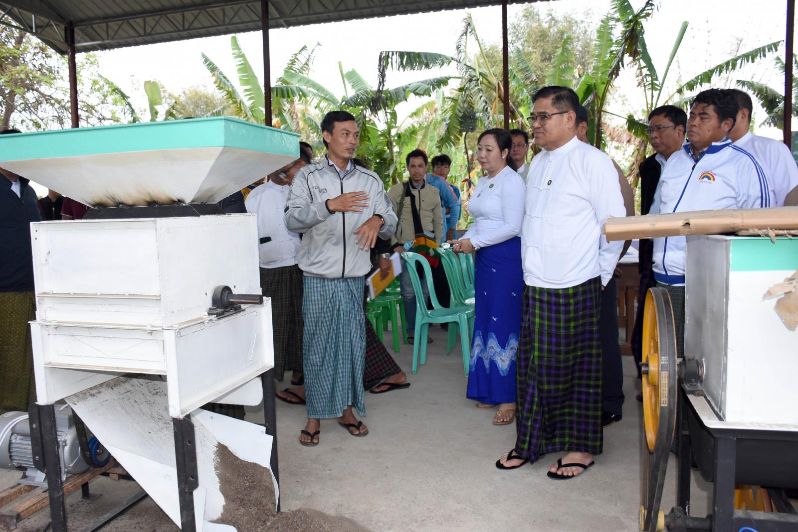ထိုမှတစ်ဆင့် ပြည်နယ်ဝန်ကြီးချုပ်နှင့်အဖွဲ့သည် ဝိုင်းမော်မြို့နယ် ခါးရှိကျေးရွာအတွင်း နိုင်ငံ့ စီးပွားမြှင့်တင်ရေးရန်ပုံငွေကျပ်သိန်း (၁၀၀၀) ဖြင့် ဒေသခံတောင်သူများအစုအဖွဲ့ဖြင့် ပေါင်ကမ်လား လယ်ယာအထောက်အကူပြုဝန်ဆောင်မှုသမဝါယမအသင်း(လီမိတက်)၏ သဘာဝမြေသြဇာထုတ် လုပ်မှုလုပ်ငန်း ဆောင်ရွက်လျက်ရှိသည့် အသင်းသား/ အသင်းသူများနှင့်တွေ့ဆုံပြီး သဘာဝမြေ သြဇာထုတ်လုပ်သွားမည့် အစီအစဉ်များနှင့် ဈေးကွက်ရရှိမှုအခြေအနေများနှင့် စပ်လျဉ်း၍တင်ပြမှုများအပေါ် ပြည်နယ်ဝန်ကြီးချုပ်က ပြည်နယ်အဆင့်ဌာနဆိုင်ရာနှင့် ကုန်ကြမ်းရရှိနိုင်မည့် အခြေအနေများ၊ နည်းပညာပံ့ပိုးကူညီပေးနိုင်ရေး၊ ဈေးကွက်ဖြန့်ဖြူးနိုင်ရေးနှင့် သွင်းအားစုများရရှိရေးတို့ကို အကြံပြုပေါင်းစပ်ဆောင်ရွက်ပေးခဲ့ကာ သဘာဝမြေသြဇာထုတ်လုပ်သွားမည့်လုပ်ငန်းအဆင့်ဆင့်နှင့် စက်ပစ္စည်းများဝယ်ယူစုဆောင်းထားရှိမှုတို့ကို လှည့်လည်ကြည့်ရှုစစ်ဆေးခဲ့ကြောင်းသိရှိရသည်။