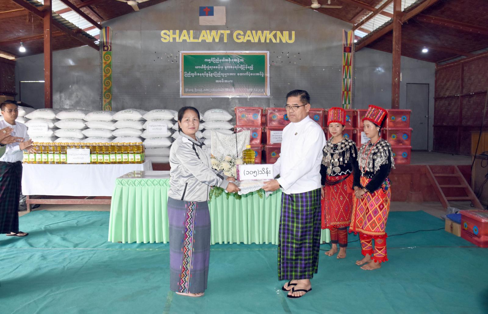 ယင်းနောက် ထောက်ပံ့ပစ္စည်းများကိုပေးအပ်ရာ ပြည်နယ်ဝန်ကြီးချုပ်၊ ပြည်နယ်ဝန်ကြီးများ၊ ပြည်နယ်ဥပဒေချုပ်၊ ပြည်နယ်ဘေးအန္တရာယ်ဆိုင်ရာစီမံခန့်ခွဲမှုဦးစီးဌာန၊ ပြည်နယ်ဦးစီးမှူးနှင့် ပြည်နယ်ကြက်ခြေနီကြီးကြပ်မှုကော်မတီတို့မှ တာဝန်ရှိသူများက ဝိုင်းမော်မြို့နယ်အတွင်းရှိ နေရပ် ဂါးရာယန်ကျေးရွာနှင့် ကဇူးယန်ကျေးရွာများသို့ ပြန်လည်ရွှေ့ပြောင်းနေထိုင်ကြမည့် မိုင်းနားဖွံ့ဖြိုးရေးခြံ KBC၊ မိုင်းနားကတ်သလစ်၊ မိုင်းနားလဝမ်၊ အမှတ်(၃)လော်ဝေါ်အေဂျီ၊ မဒိန်နှင့် အမှတ်(၂) မြို့မနှစ်ခြင်း IDPs စခန်းများမှ အိမ်ထောင်စု ၁၀၅ စု၊ လူဦးရေ ၅၅၀ ဦးတို့အတွက် ပြည်နယ်အစိုးရ အဖွဲ့မှ တစ်အိမ်ထောင်လျှင် ဆန်(၁)အိတ်၊ ဆီ (၁)ပုံးစီနှင့် ဘေးအန္တရာယ်ဆိုင်ရာစီမံခန့်ခွဲမှုဦးစီးဌာနမှ ပြောင်းရွှေ့စရိတ် ငွေကျပ် ၁၀၀၀၀၀၊ Family Kit (၁)ပုံးစီနှင့် (၁)လစာဆန်ရိက္ခာဖိုးငွေကျပ် ၄၉၅၀၀၀၀၊ ပြည်နယ်ကြက်ခြေနီ ကြီးကြပ်မှုကော်မတီမှ Hygiene Kit ၊ Shelter Tool Kit ၊ Dignity Kit (၁)ပုံးစီဖြင့် ငွေသားနှင့်ပစ္စည်း စုစုပေါင်းတန်ဖိုးငွေကျပ် ၃၉၄၉၅၀၀၀ အသီးသီးထောက်ပံ့ပေးအပ်ခဲ့ကြရာ ဒေသခံပြည်သူတစ်ဦးက ကျေးဇူးတင်စကားပြန်လည်ပြောကြားခဲ့သည်။