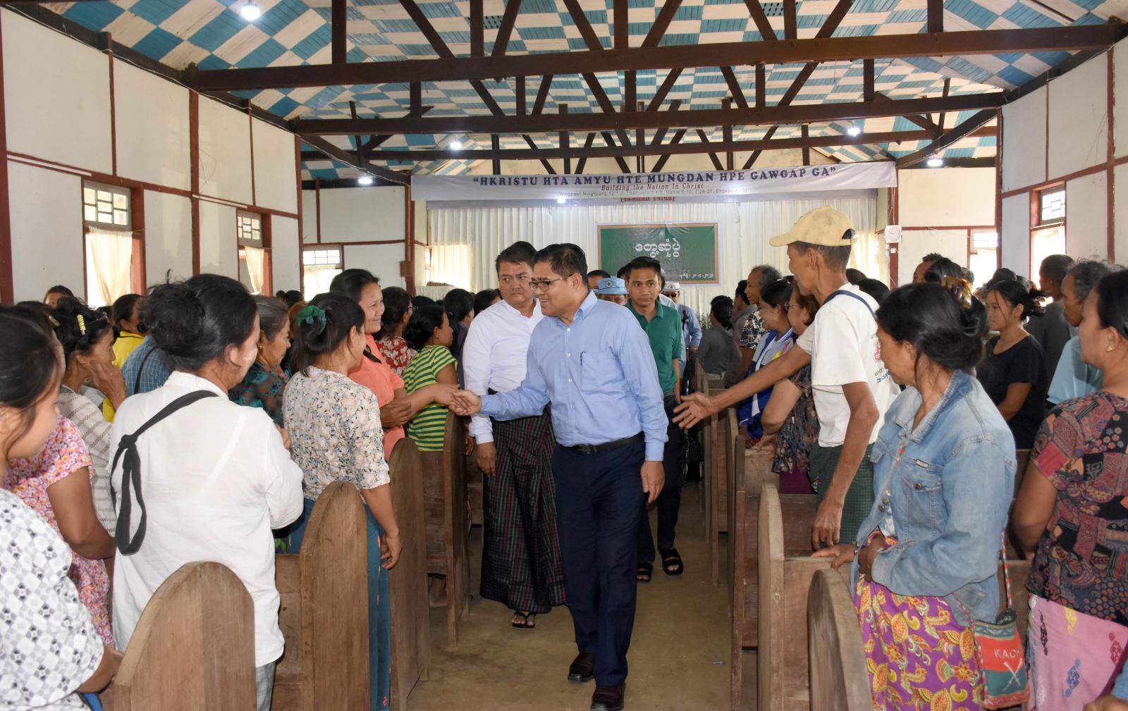 ထို့နောက် ကဇူးကျေးရွာမှတစ်ဆင့် ဒဘတ်ယန်ကျေးရွာသို့သွားရောက်ပြီး ကျေးရွာအုပ်ချုပ်ရေးမှူးရုံး၊ ခန်းမဆောင်၌နေရပ်စွန့်ခွာယာယီစခန်းများမှ ပြန်လည်ရွှေ့ပြောင်းနေထိုင်ကြသည့် အိမ်ထောင်စုများနှင့်တွေ့ဆုံပြီး ပြည်နယ်ဝန်ကြီးချုပ်က ပြန်လည်အခြေချနေထိုင်သည့် မိသားစုများ၏နေထိုင်စားသောက်မှု အဆင်ပြေစေရေး၊ ကျေးရွာဖွံ့ဖြိုးတိုးတက်ရေးအတွက် လိုအပ်သည်များကို ဖြည့်ဆည်းဆောင်ရွက်ပေးနိုင်ရေးနှင့် မိမိတို့ရပ်ရွာဖွံ့ဖြိုးတိုးတက်ရေးအတွက် အစိုးရအဖွဲ့၊ ဌာန ဆိုင်ရာများနှင့် ဝိုင်းဝန်းပူးပေါင်းဆောင်ရွက်ကြရေး အားပေးပြောကြားပြီး ကျေးရွာအုပ်ချုပ်ရေးမှူးနှင့် ရပ်မိ/ရပ်ဖများ၏ ကျေးရွာဖွံ့ဖြိုးတိုးတက်ရေးအတွက် တင်ပြချက်များအပေါ် ဌာနဆိုင်ရာတာဝန်ရှိသူ များနှင့် ညှိနှိုင်းပေါင်းစပ်ဆောင်ရွက်ပေးခဲ့သည်။