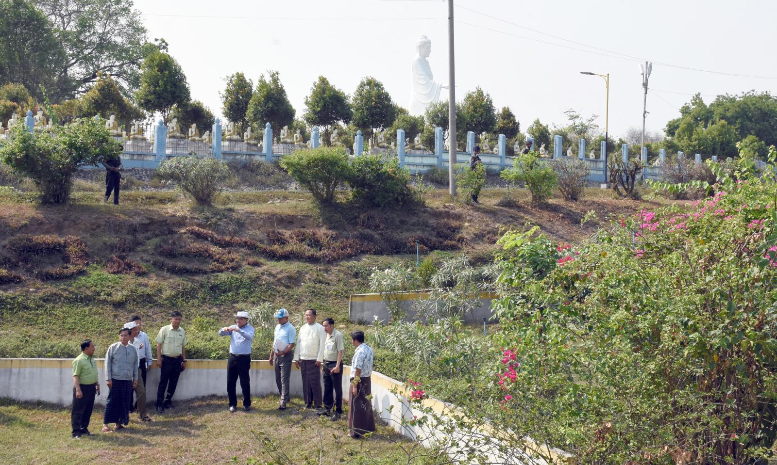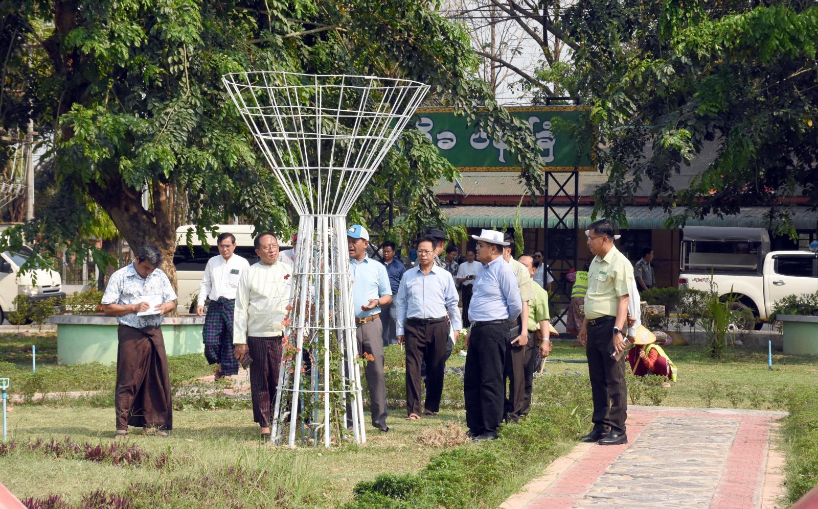 ထိုသို့ ဆောင်ရွက်ရာတွင် ပြည်နယ်ဝန်ကြီးချုပ်သည် ပြည်နယ်စီးပွားရေးရာဝန်ကြီး ဦးမျိုးဆွေ၊ ပြည်နယ်သယံဇာတရေးရာဝန်ကြီးဦးတိန့်ဆောင်၊ ပြည်နယ်စည်ပင်သာယာရေးအဖွဲ့ညွှန်ကြားရေးမှူး ဦးကျော်လင်း၊ ပြည်နယ်အဆင့်ဌာနဆိုင်ရာများနှင့်အတူ မြစ်ကြီးနားမြို့ ပြည်ထောင်စုလမ်းမကြီး ဘေး အောင်စေရန်အောင်ဘုရားအနီး We Love Myitkyina ဆိုင်းဘုတ်စိုက်ထူထားရာ တြိဂံအဝိုင်း ပတ်နေရာ၌ မြေယာရှုခင်းပြုပြင်၍ စက္ကူပန်းအပါအဝင် အလှပန်းပင်များ စိုက်ပျိုးနိုင်ရေးနှင့် လမ်း ဘေးဝဲ/ယာများတွင်လည်း ပန်းပင်များ ဖူးပွင့်ဝေဆာစွာ စိုက်ပျိုးထားရှိရေး ကြည့်ရှုစစ်ဆေးသည်။