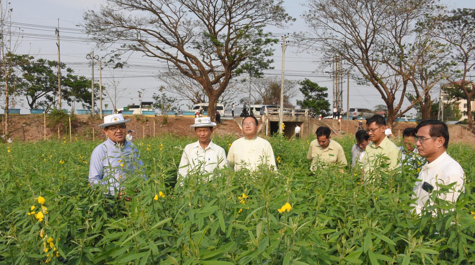 ယင်းနောက် မြစ်ကြီးနား မန်ခိန်ရပ်ကွက်ရှိ စိုက်ပျိုးရေးဦးစီးဌာန၏ ဧက ၁၀၀ စံပြစိုက်ကွက်အတွင်း မိုးရာသီစိုက်ပျိုးချိန်အမီ ပိုက်ဆံလျော်ပင်များ စိုက်ပျိုးထားရှိမှုများကို ကြည့်ရှုစစ်ဆေးခဲ့ကြသည်။