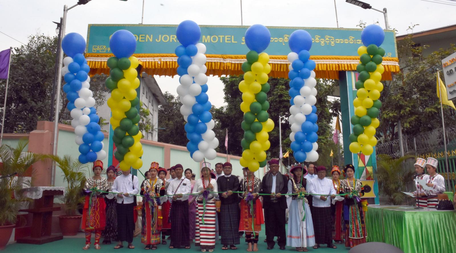 ဆက်လက်၍ အသစ်တည်ဆောက်ထားသည့် Goden Jordan မိုတယ်အား ပြည်နယ်ဝန်ကြီးချုပ်၊ တာဝန်ရှိသူများက ဖဲကြိုးဖြတ် ဖွင့်လှစ်ပေးကြပြီး အမှတ်တရ စုပေါင်းမှတ်တမ်းတင်ဓာတ်ပုံ ရိုက်ကူးခဲ့ကြကြောင်း သိရသည်။