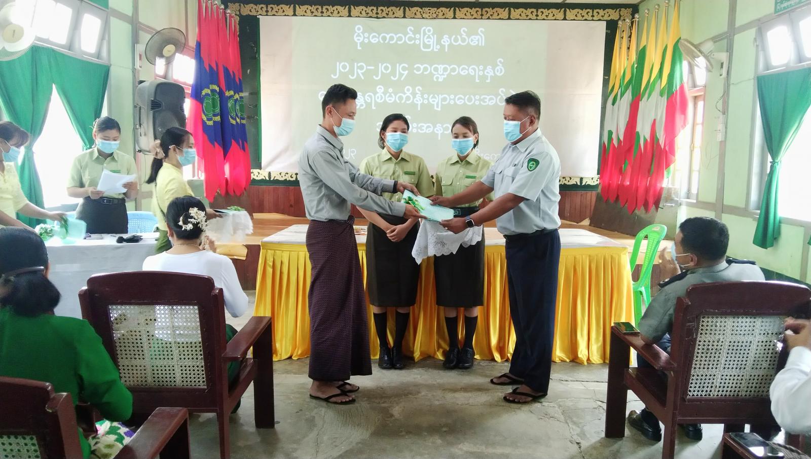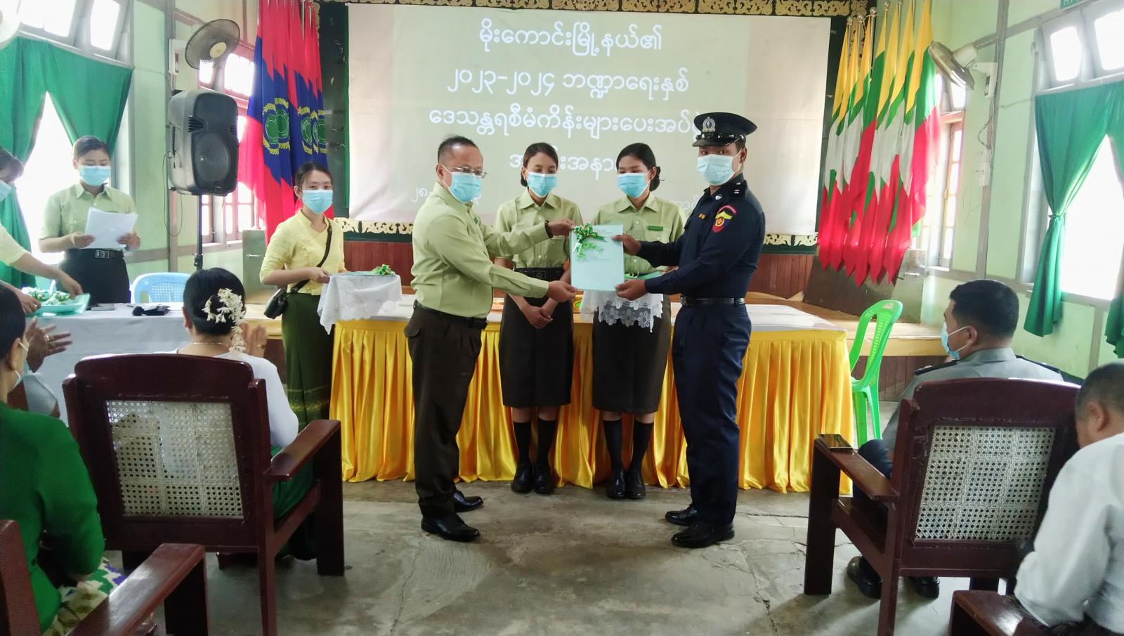ကချင်ပြည်နယ်၊ မိုးညှင်းခရိုင်၊ မိုးကောင်းမြို့နယ်၏ ၂၀၂၃-၂၀၂၄ ဘဏ္ဍာရေးနှစ် ဒေသန္တရစီမံကိန်းလုပ်ငန်းများ လွှဲပြောင်းပေးအပ်ပွဲကို မြို့နယ်အထွေထွေအုပ်ချုပ်ရေးဦးစီးဌာန အစည်းအဝေး ခန်းမ၌ ယမန်နေ့လယ်(၁၁)နာရီတွင် ကျင်းပသည်။ အခမ်းအနားတွင် မြို့နယ်စီမံကိန်းရေးဆွဲ အကောင်အထည်ဖော်ရေးကော်မတီဥက္ကဋ္ဌ ဦးခင်မောင်မြင့်က အဖွင့်အမှာစကားပြောကြားပြီး အတွင်းရေးမှူး ဒေါ်သီတာမိုးက ဒေသန္တရစီမံကိန်း လုပ်ငန်းများနှင့်ပတ်သက်၍ ရှင်းလင်းပြောကြားသည်။