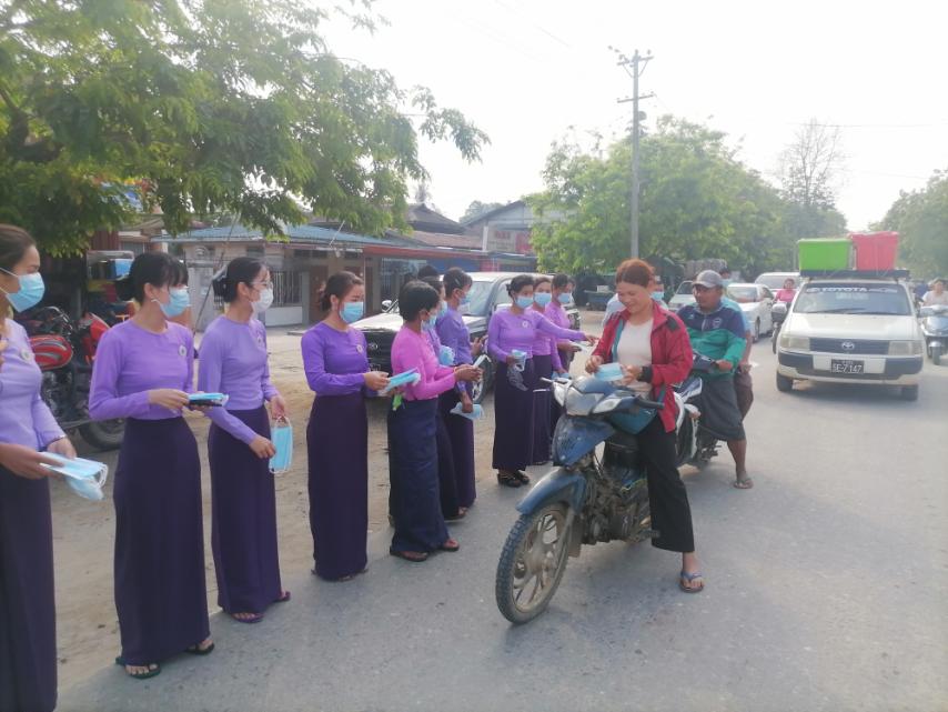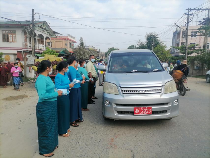 အသိပညာပေးဆောင်ရွက်ခြင်းကို ခရိုင်၊ မြို့နယ် ကိုဗစ်-၁၉ ရောဂါ ထိန်းချုပ်ရေးနှင့် အရေးပေါ်တုံ့ပြန်ရေးကော်မတီဥက္ကဋ္ဌမှ ဦးဆောင်၍ ခရိုင်စီမံအုပ်ရေး အဖွဲ့ဥက္ကဋ္ဌ ဦးမိုးဇော်လင်းနှင့် အဖွဲ့၀င်များ၊ မြို့နယ်စီမံအုပ်ချုပ်ရေးအဖွဲဥက္ကဋ္ဌ ဦးအောင်စိုးနှင့် အဖွဲ့၀င်များ၊ ဌာနဆိုင်ရာများ၊ ရပ်ကွက်အုပ်ချုပ်ရေးမှူးများ၊ မြို့နယ်အမျိုးသမီးရေးရာ အသင်းတို့ကပူးပေါင်း၍ ဒေသအတွင်း သွားလာကြသည့် ခရီးသွားပြည်သူများအား ကျန်းမာရေး၀န်ကြီးဌာနက ထုတ်ပြန်ထားသည့် ကိုဗစ်-၁၉ ရောဂါ စည်းကမ်းချက်များကို လိုက်နာကျင့်သုံးကြရန်နှင့် ပါးစပ်နှာခေါင်းစည်း mask ကို လူထူထပ်သည့် နေရာများသို့သွားလာပါက စနစ်တကျ တပ်ဆင်သွားလာကြရန် အသိပညာပေးပြီး ဌာနဆိုင်ရာ စုပေါင်းအင်အား(၇၀) ဦးခန့်က နှာခေါင်းစည်း mask ခုရေ (၁၀၀၀) အား အခမဲ့ဖြန့်ဝေပေးခြင်း ဆောင်ရွက်ခဲ့ကြကြောင်း သိရသည်။
