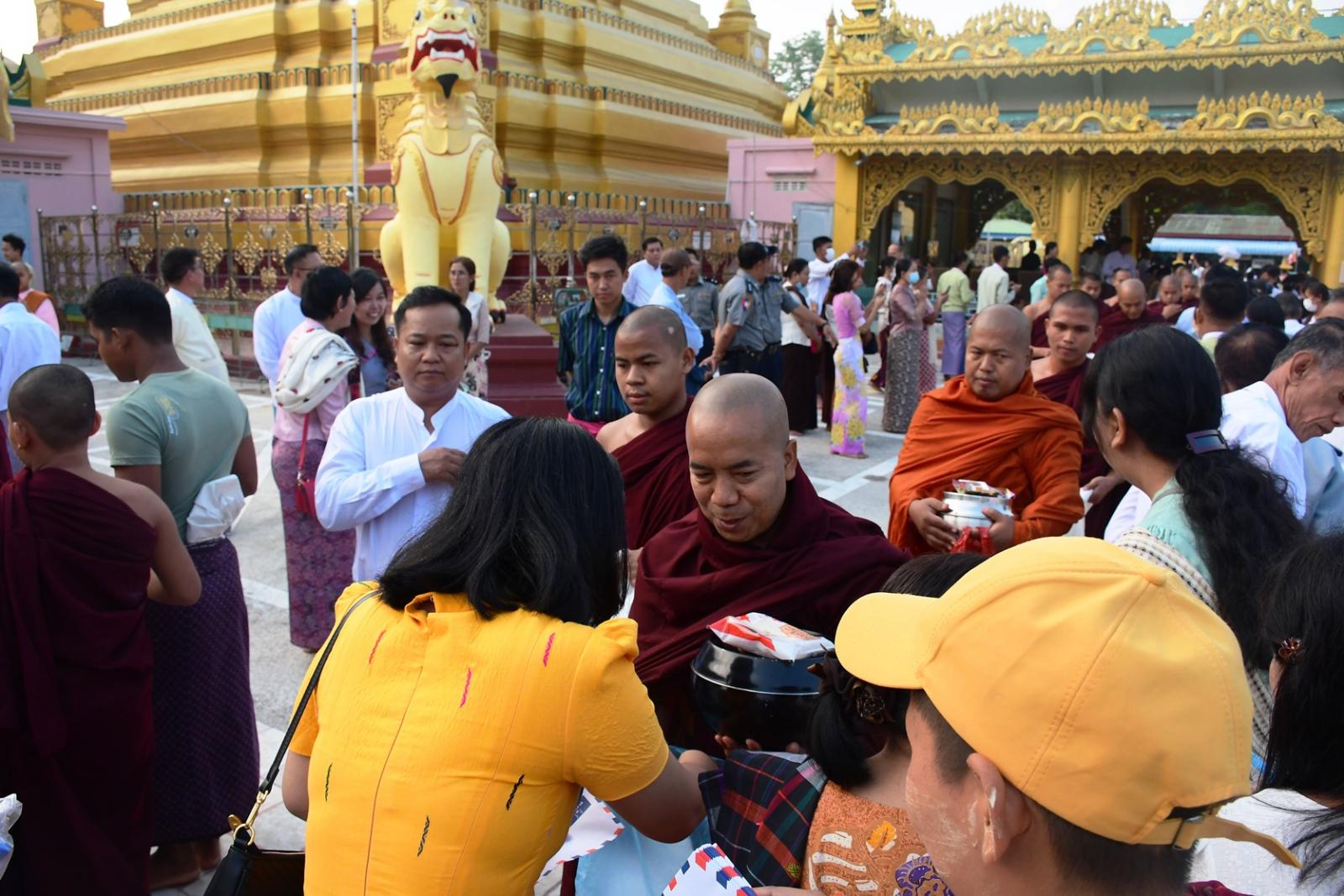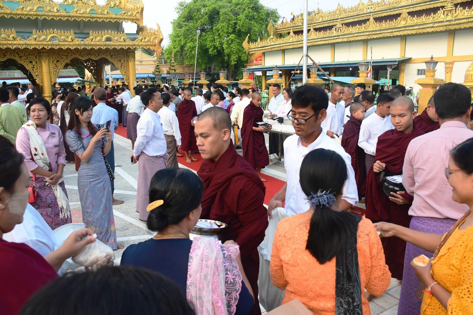 ထို့နောက် ဘုရားအမှူးရှိသော ပင့်သံဃာတော် ၁ဝ၈ ပါးတို့အား ဒုတိယခရိုင် အုပ်ချုပ်ရေးမှူး ဦးလွှမ်းမိုးဟန်၊ ခရိုင်စီမံအုပ်ချုပ်ရေးအဖွဲ့ဝင် ဦးကျော်ဇေယျနှင့် အဖွဲ့ဝင်များ၊ မြို့နယ်စီမံအုပ်ချုပ်ရေးအဖွဲ့ဥက္ကဋ္ဌ ဦးဇော်အောင်လေးနှင့် အဖွဲ့ဝင်များ၊ ခရိုင်မြို့နယ်အဆင့်ဌာနဆိုင်ရာ တာဝန်ရှိသူများ၊ ရပ်ကွက် အုပ်ချုပ်ရေးမှူးများနှင့် အလှူရှင်များက ဆွမ်းဆန်များ၊လှူဖွယ်ဝတ္တုများကို ဆက်ကပ်လောင်းလှူ ကြသည်။ ၎င်းနောက် ရွှေမြင်တင်စေတီတော်၏ အရှေ့တောင်ထောင့်အရပ်ရှိ မဟာဗောဓိညောင်ပင်အား ညောင်ရေသွန်းလောင်းခြင်းကို တာဝန်ရှိသူများနှင့် ဆွမ်းလောင်းလှူပွဲလာရောက် လောင်းလှူကြသည့် အလှူရှင်များနှင့် ဒေသခံပြည်သူများက ဆောင်ရွက်ကြောင်းသိရသည်။