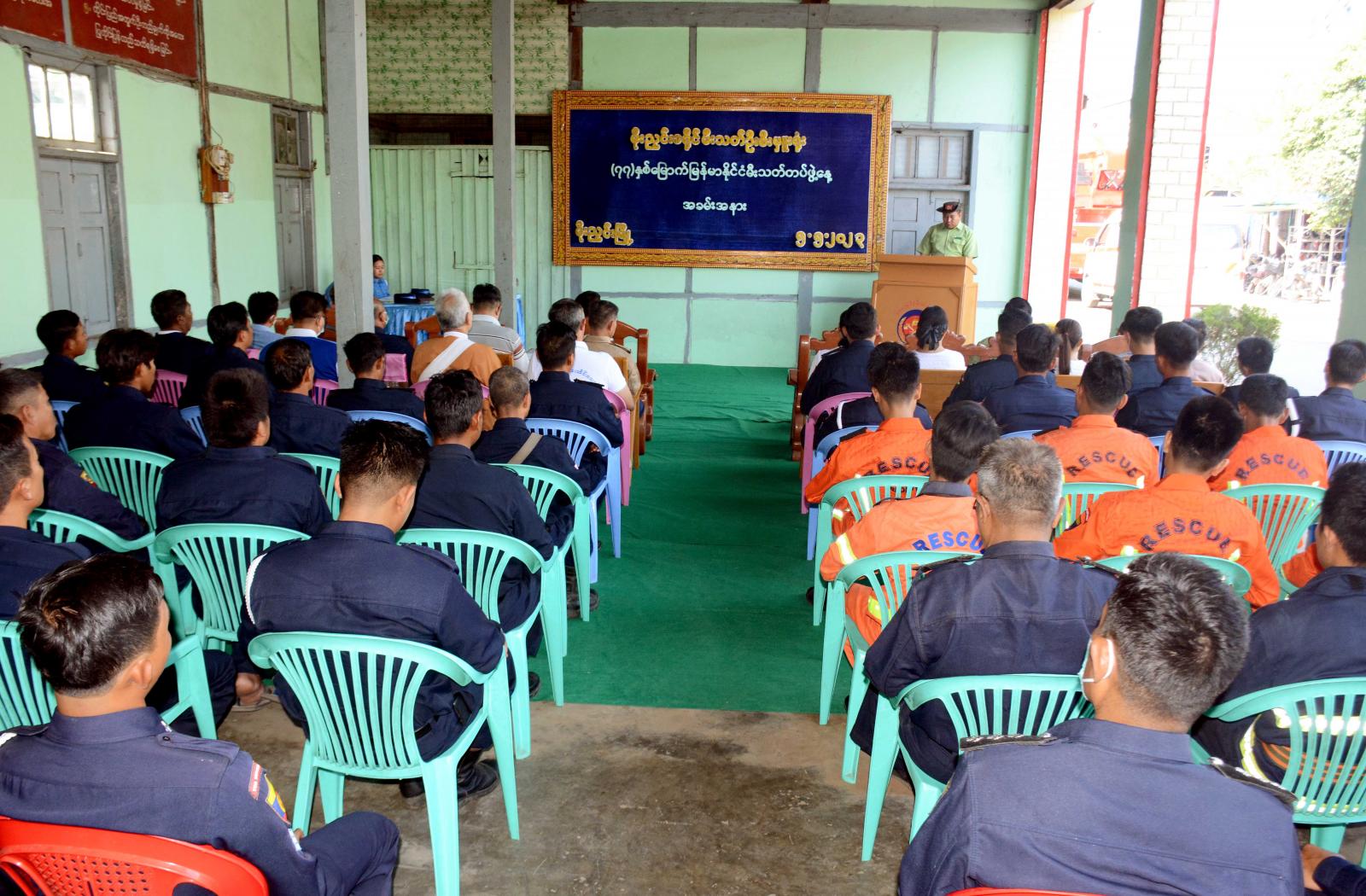 ရှေးဦးစွာ အခမ်းအနားတွင် ခရိုင်စီမံအုပ်ချုပ်ရေးအဖွဲ့ဥက္ကဋ္ဌ ဦးညီညီလွင်က မြန်မာနိုင်ငံ မီးသတ်တပ်ဖွဲ့အနေဖြင့် ပြည်သူလူထု အတွင်း မီးဘေးလုံခြုံရေး၊ သဘာဝဘေးအန္တရာယ် ကာကွယ်ရေး၊ ရှာဖွေကယ်ဆယ်ရေး၊ ပြည်သူ့အကျိုးပြုဆောင်ရွက်ရေးစသည့် ရှည်မှန်းချက် တာဝန်များကို ဦးလည်မသုန် တာဝန်ထမ်းဆောင်ခဲ့ကြသည့် ရှေးမီးသတ်သမားကြီးများ၏ မျက်မှောက်ခေတ် ပြည်သူ့ဝန်ဆောင်မှု လုပ်ငန်းဖြစ်သော မီးသတ်လုပ်ငန်းဆိုင်ရာများကို စွမ်းအားပြည့် တာဝန်ထမ်းဆောင်နေကြသော မီးသတ် တပ်ဖွဲ့ဝင်များအားလုံးကို ဂုဏ်ပြုအပ်ပါကြောင်း ပြောကြားသည်။